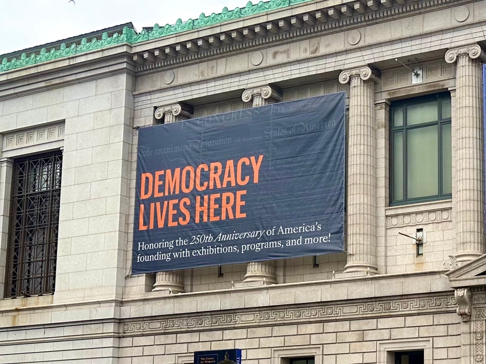 I faced this question recently when, in a recent meeting, we needed copy for our façade banners announcing our 250th exhibitions. Bantering catchy titles on the Declaration or the 250th, we settled on a wordplay of sorts: “Democracy Lives Here.”