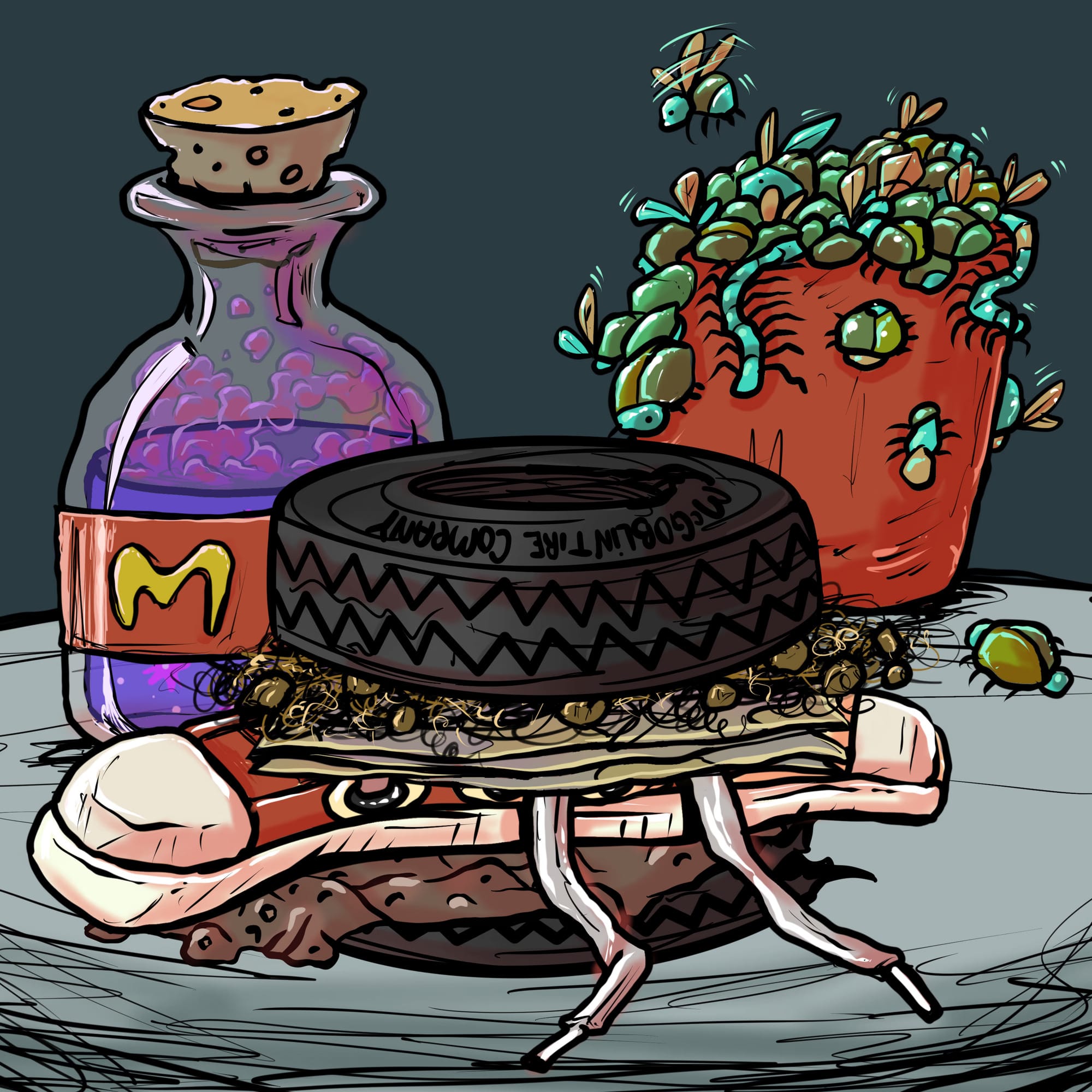 With characters fleshed out in Twitter Spaces and through the main goblintown Twitter account (with its distinctive language and script), the blockchain itself became a setting for further stages of the “story.” Holders of NFTs were able to “build” their own McGoblin Burgers, with disgusting ingredients like “pulld ork dongz,” “eer funguss,” “dwarf pyoobz,” and “pee soss.” Subsequently, these NFT burgers were used as “bait” to trap grumpls, a much cuter creature that farts a lot.