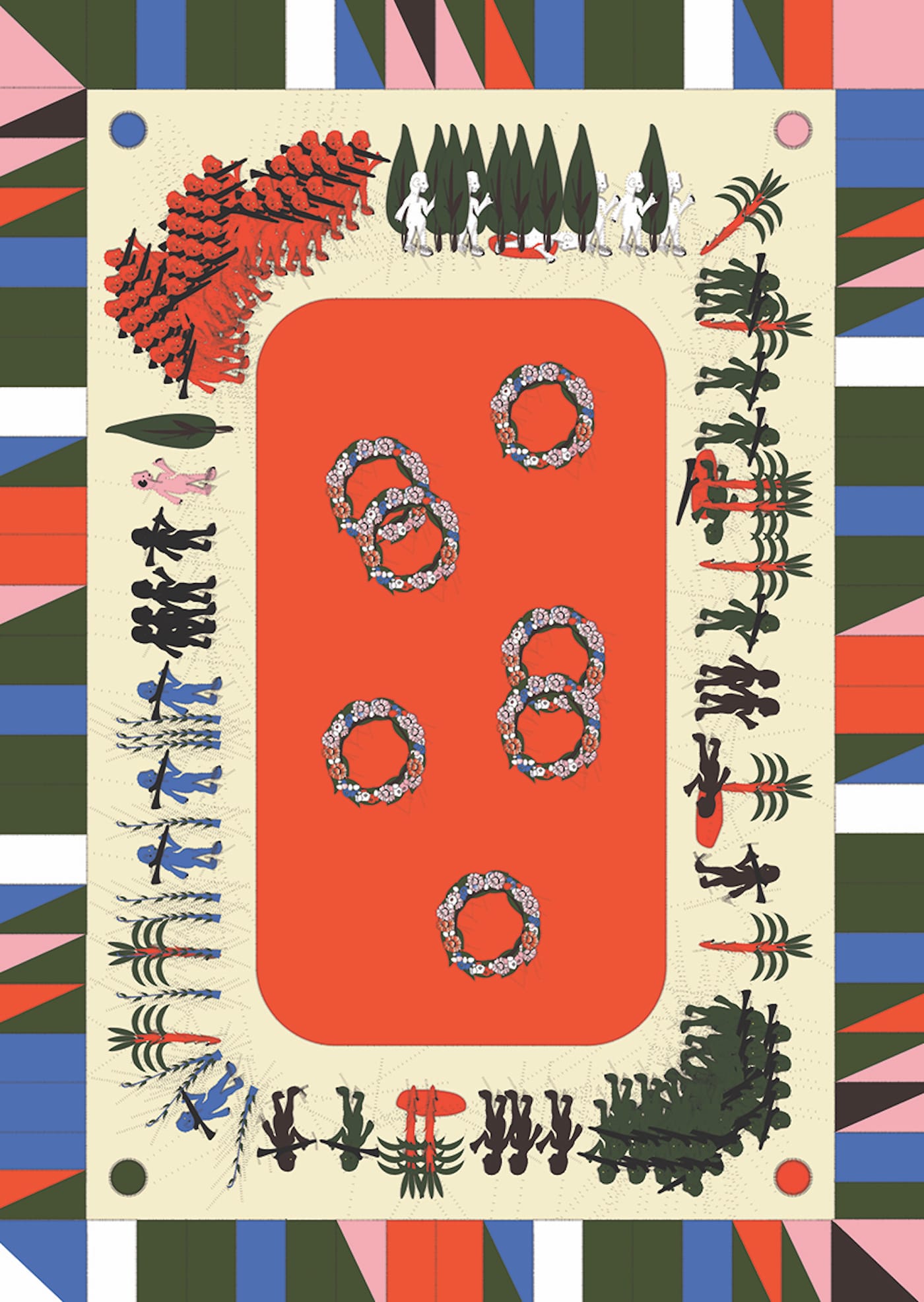 The one I’m referring to here Is Noam Noy’s expression of cyclical fear, hatred, and bloodshed. Wreaths of flowers sit in a pool of blood as armies of militiamen hunt unarmed civilians through cypress trees. a man falls dead under a palm tree, bathed in a red puddle. The flag’s border is a mix of rectangles and triangles, all filled reds, blues, greens, pinks, and purples.