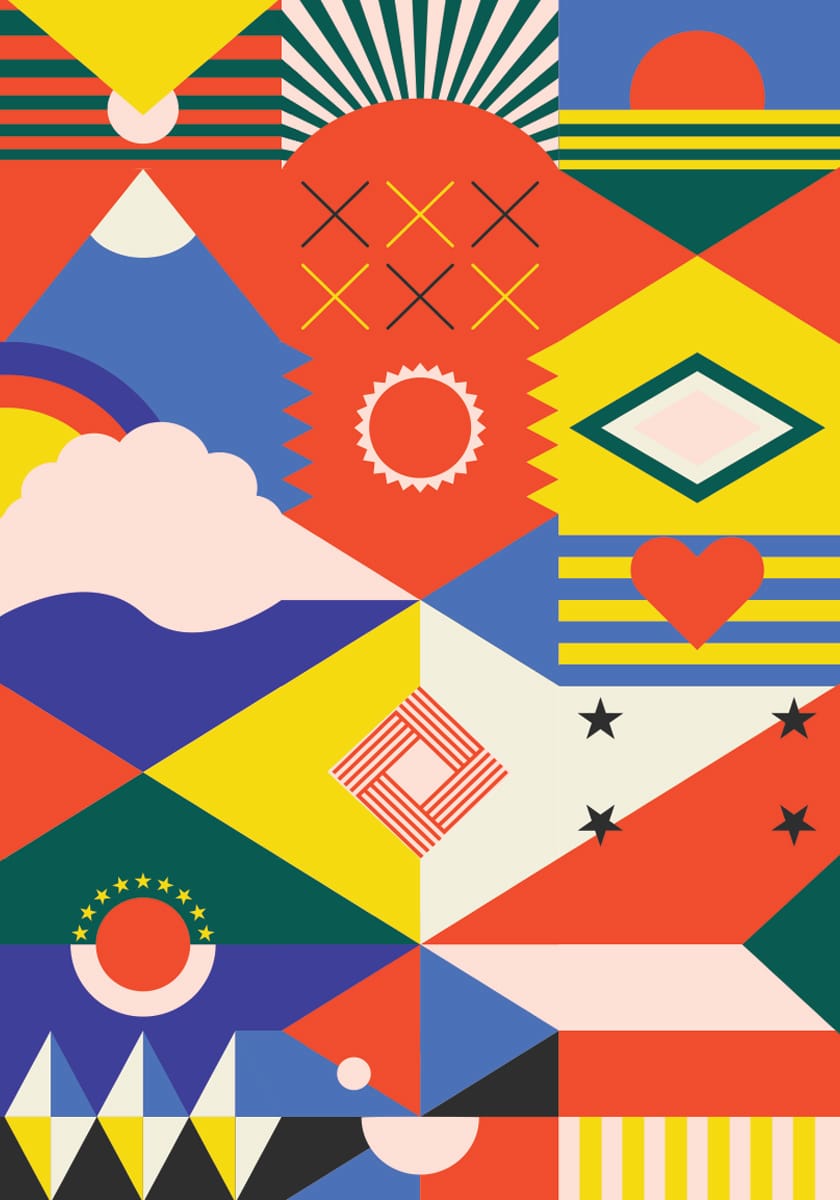 Similarly crowded, but with a bit more abstraction and finesse is Studio Re-Levant’s optimistic design, which combines 36 utopian flags as one unified international symbol. All esoteric in their designs, there are several symbols that repeatedly appear on this single flag: suns rising, sprawling mountains, voluptuous clouds. There’s even a massive heart. (A little too on the nose, no?)