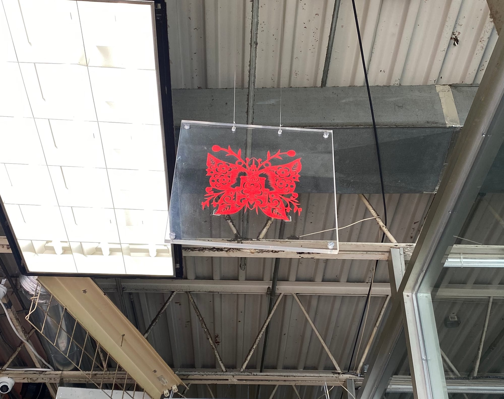 A community-driven exhibition, Home-O-Stasis is interwoven into the mini-mall space as though camouflaged, blending in and standing out in understated yet profound ways. At the building’s entrance among hanging real estate ads, shoppers are greeted by a red paper-cut butterfly made by Chinese artist Xiyadie, who was taught traditional paper-cut artistry by his grandmother. Decorated with Buddhist etchings and an impression of the U-Haul clocktower on College Point Boulevard, the delicate work was created for the migrant workers who come to the mini-mall in search of housing.