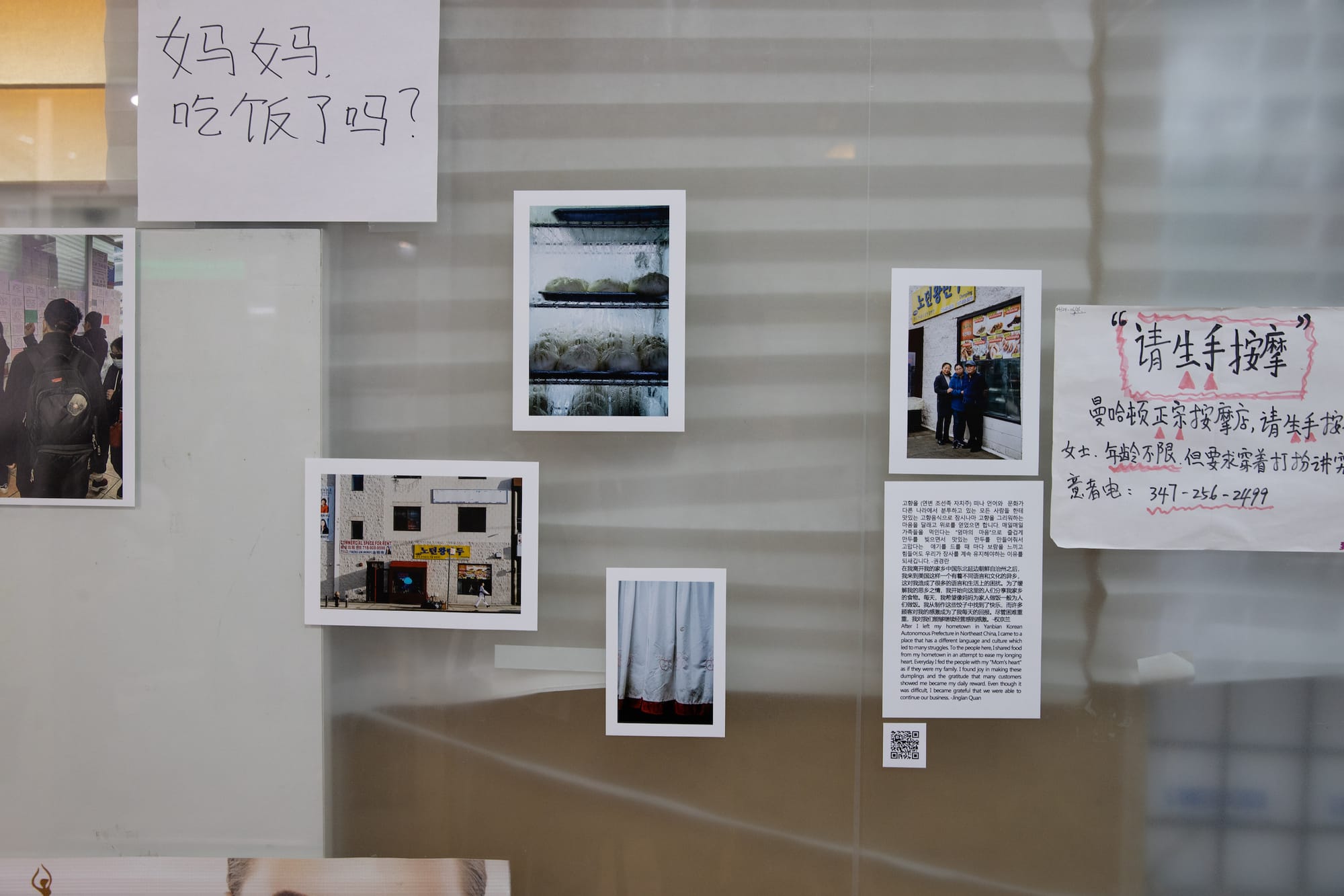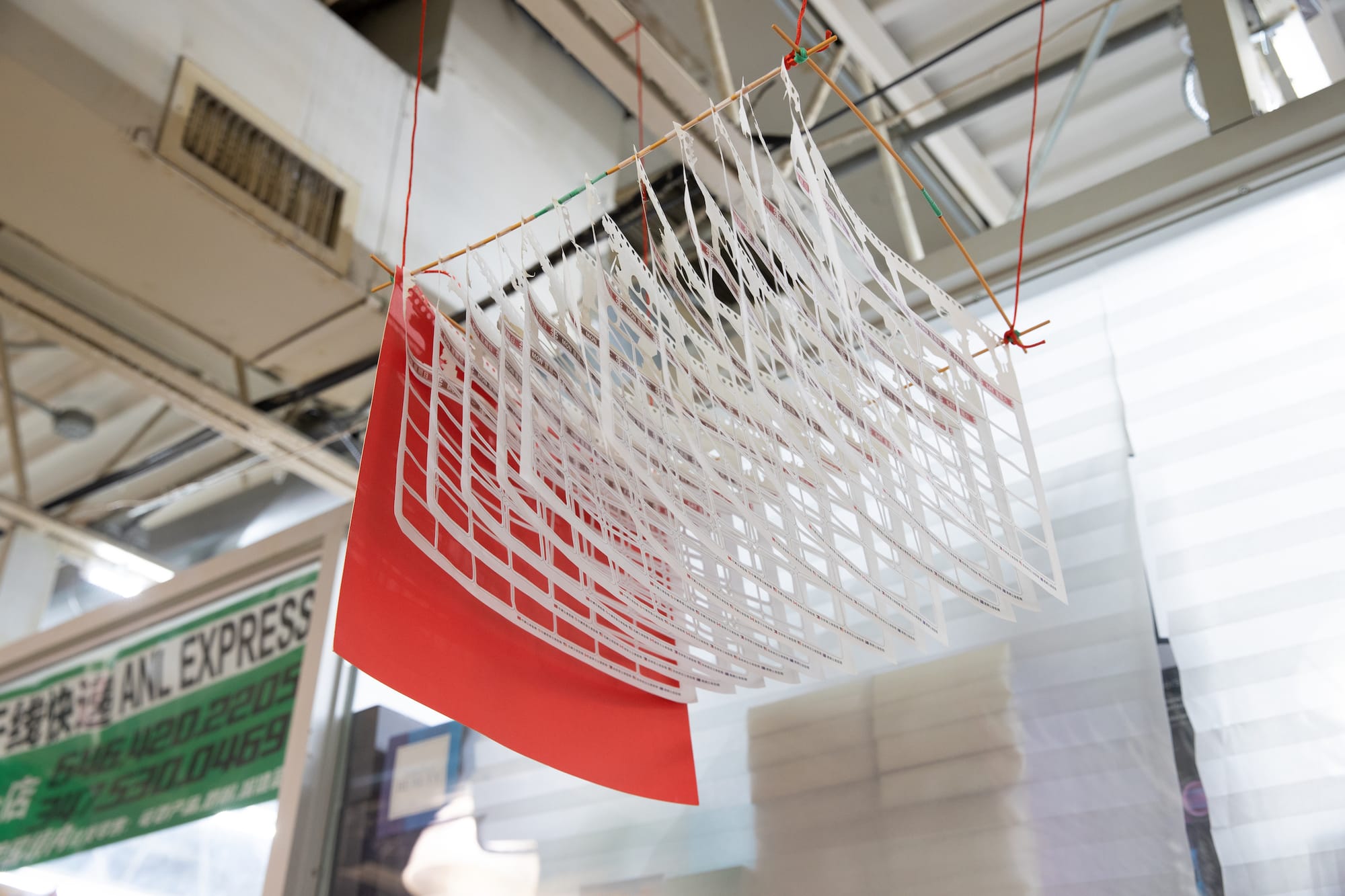 Subtly mixed amongst the room-for-rent flyers promoting low-cost and short-term leases, a handwritten sign written by Xueli Wang that reads “Mom, have you eaten?” catches people searching the bulletin board off guard. Above the paper ads directly in view of the shop owners, a deconstructed calendar with dates and symbols carefully cut out by hand hangs from two delicate red threads tied to the ceiling beams — an allusion to the boundless, continual nature of passing time by Flushing-born sculptor Anne Wu.