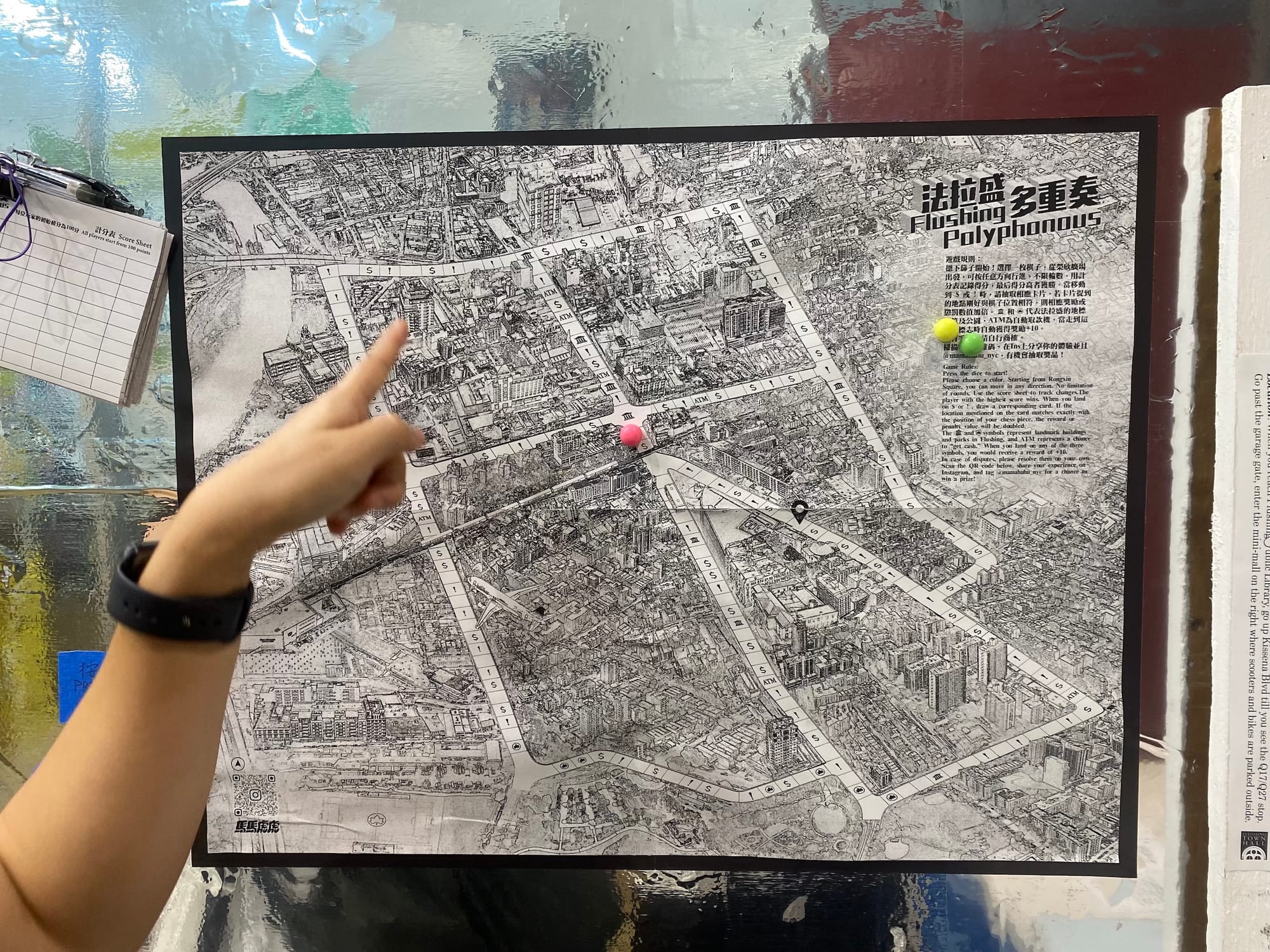Evoking the way in which local residents identify local places by familiar landmarks and experiences instead of official names, most of the artworks on display aren’t labeled. In place of a numbered address, the exhibition’s location is a set of descriptive directions using community markers. For Home-O-Stasis, Yuki He and Qianfan Gu from the collective Mamahuhu created “Flushing Polyphonous” (2023), a humorous reinterpretation of Flushing’s map as a Monopoly-like board game. With magnetic pieces and a pair of die, the game takes players through the Queens neighborhood focusing on landmarks and shared hyperlocal experiences.
