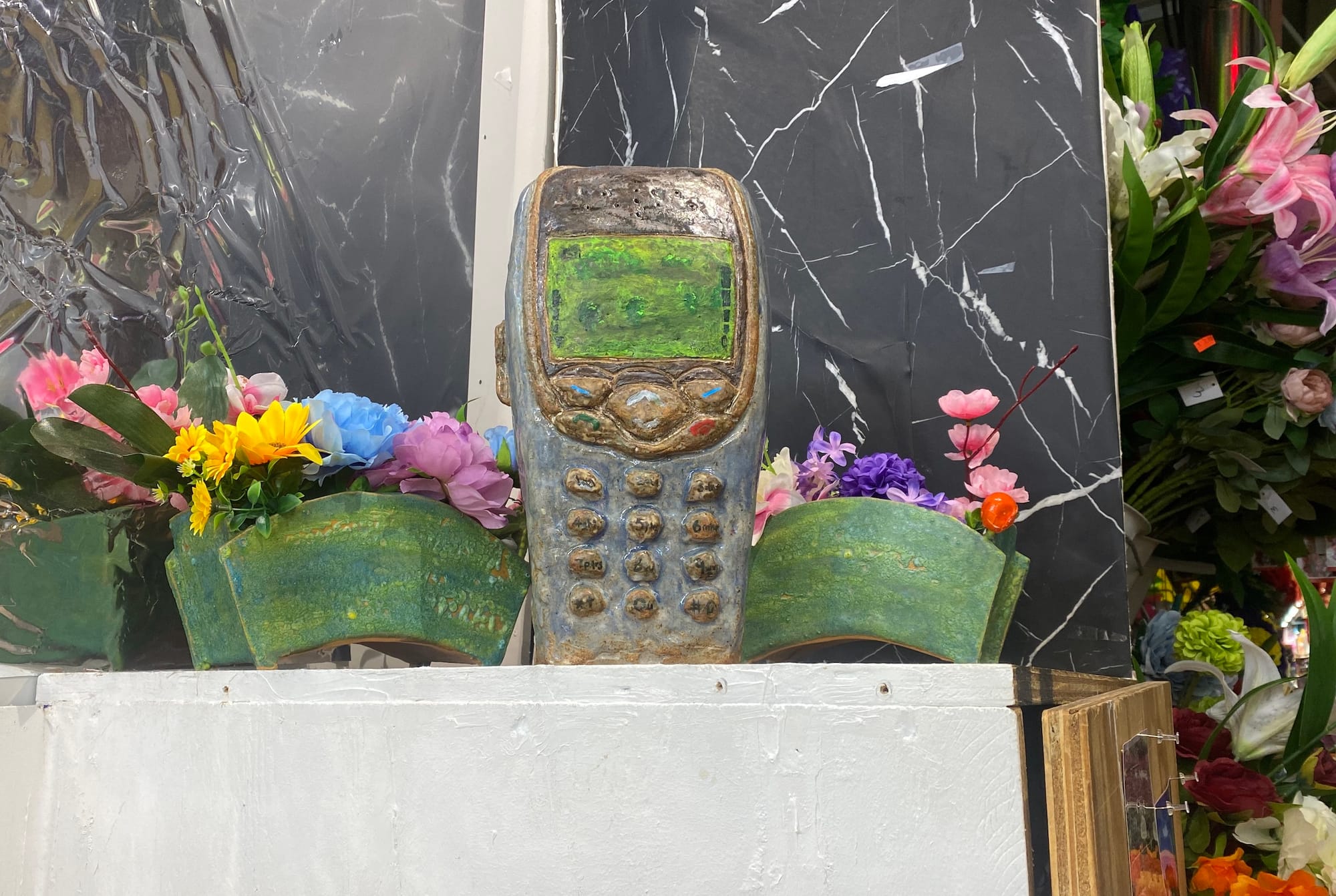 A filmmaker and sculptor, Zhang sculpted a ceramic Nokia 8210 phone for the exhibition. The vintage phone is an homage to a display that previously sat on top of the mini-mall facade before it was taken down during the pandemic. Her husband Herb Tam, a curator at the Museum of Chinese in America and a painter, also has work in the show. A co-curator for the exhibition, Tam contributed a series of small paintings that display candid, intimate scenes of Flushing residents around the neighborhood.