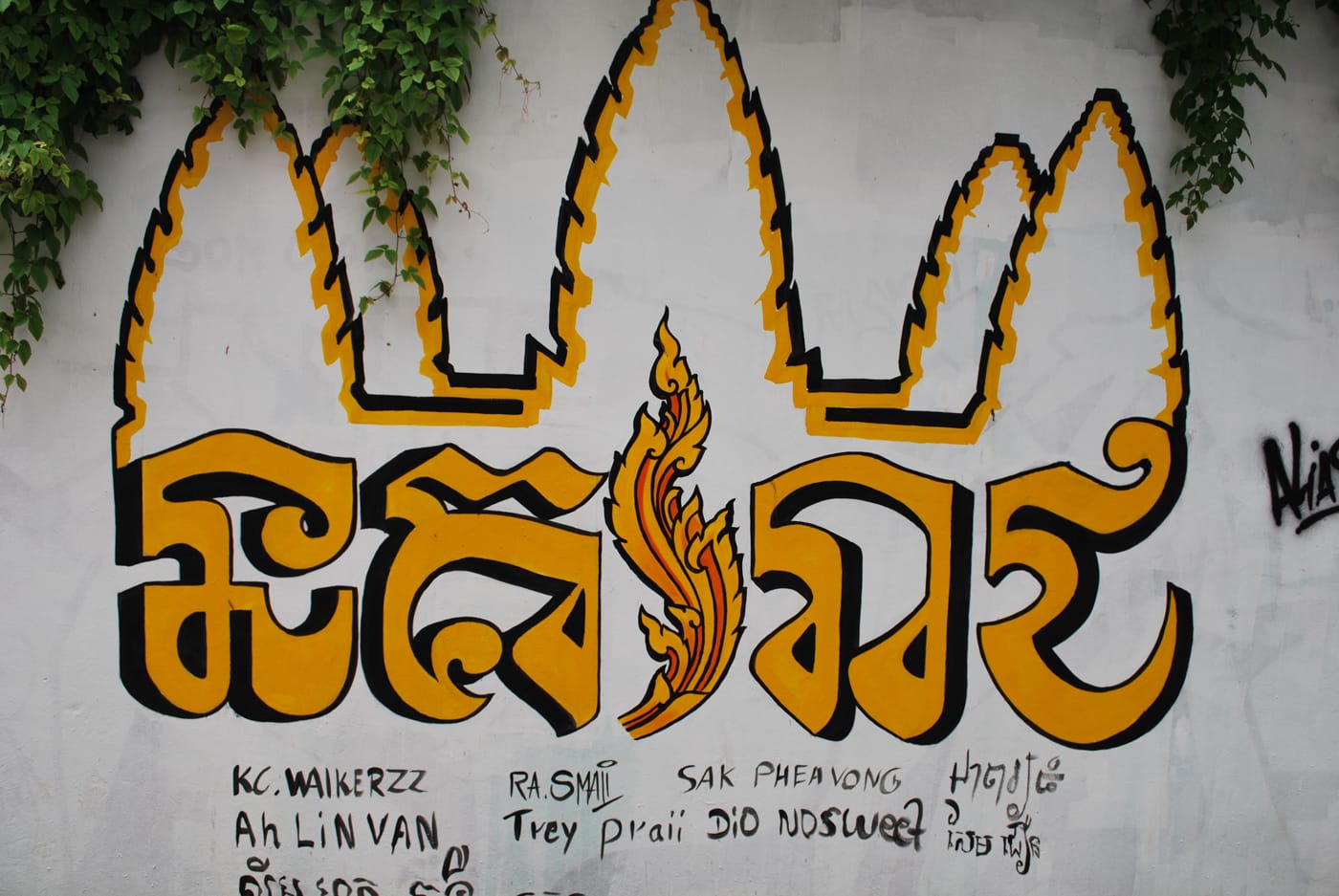 In Phnom Penh, two of the current graffiti stars are Lisa Mam, who is considered Cambodia’s first and definitely most successful female street artist, and Chifumi, a prolific foreigner based in Phnom Penh who helps organize the Cambodia Urban Arts Festival with the French Institute. Both Mam and Chifumi combine contemporary illustration with traditional decorative styles from Khmer architecture and sculpture called Kbach (ក្បាច់). Chifumi is most recognizable for his depictions of the hyperextended fingers of traditional Cambodian Apsara dancers.