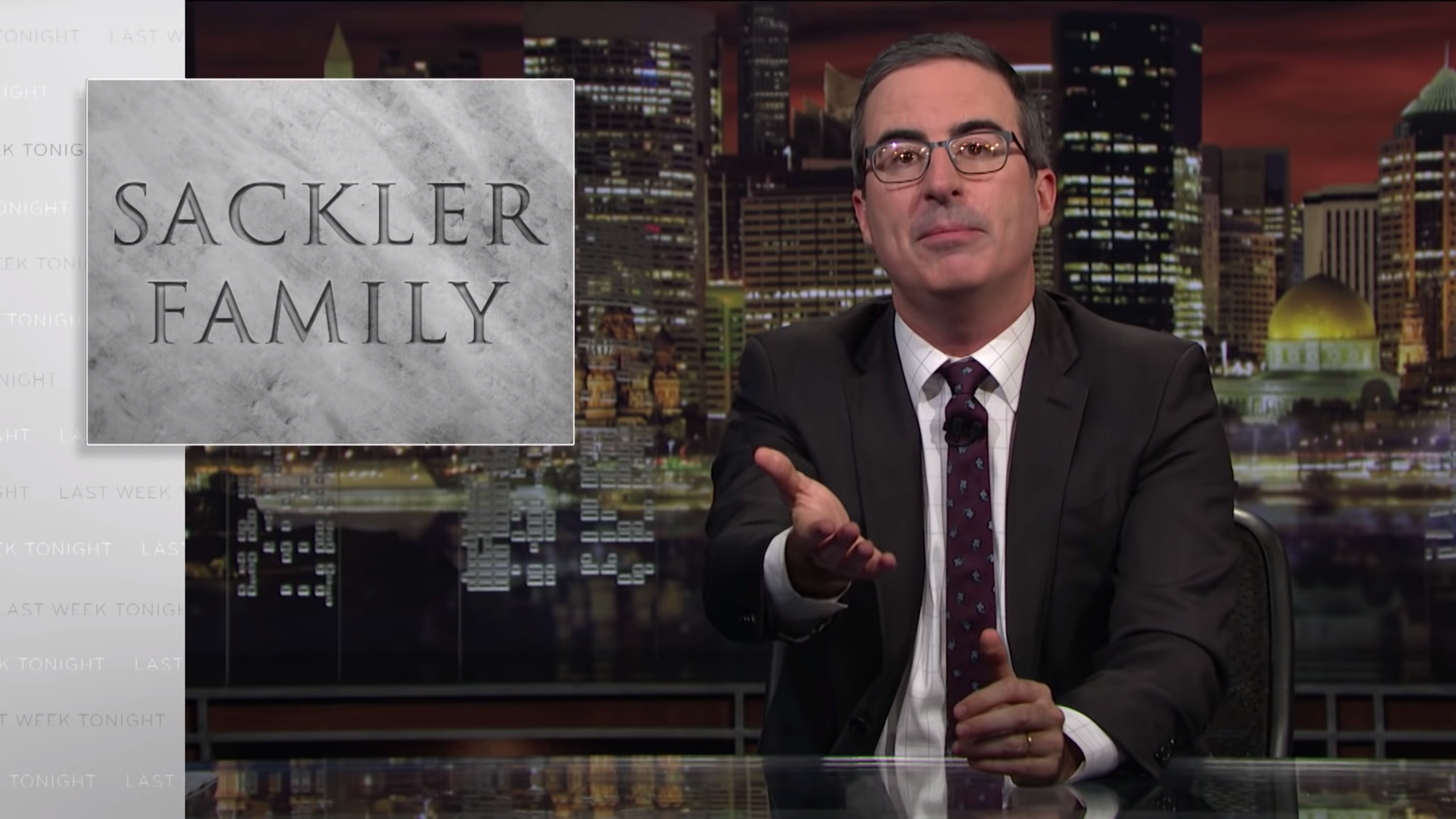 “The Sacklers love putting their names on things,” Oliver said of the founders of Purde Pharma, producer of OxyContin, after listing the numerous art institutions that carry the family’s name on their building; “although until very recently they have been miraculously good at keeping their name off the opioid crisis.”
