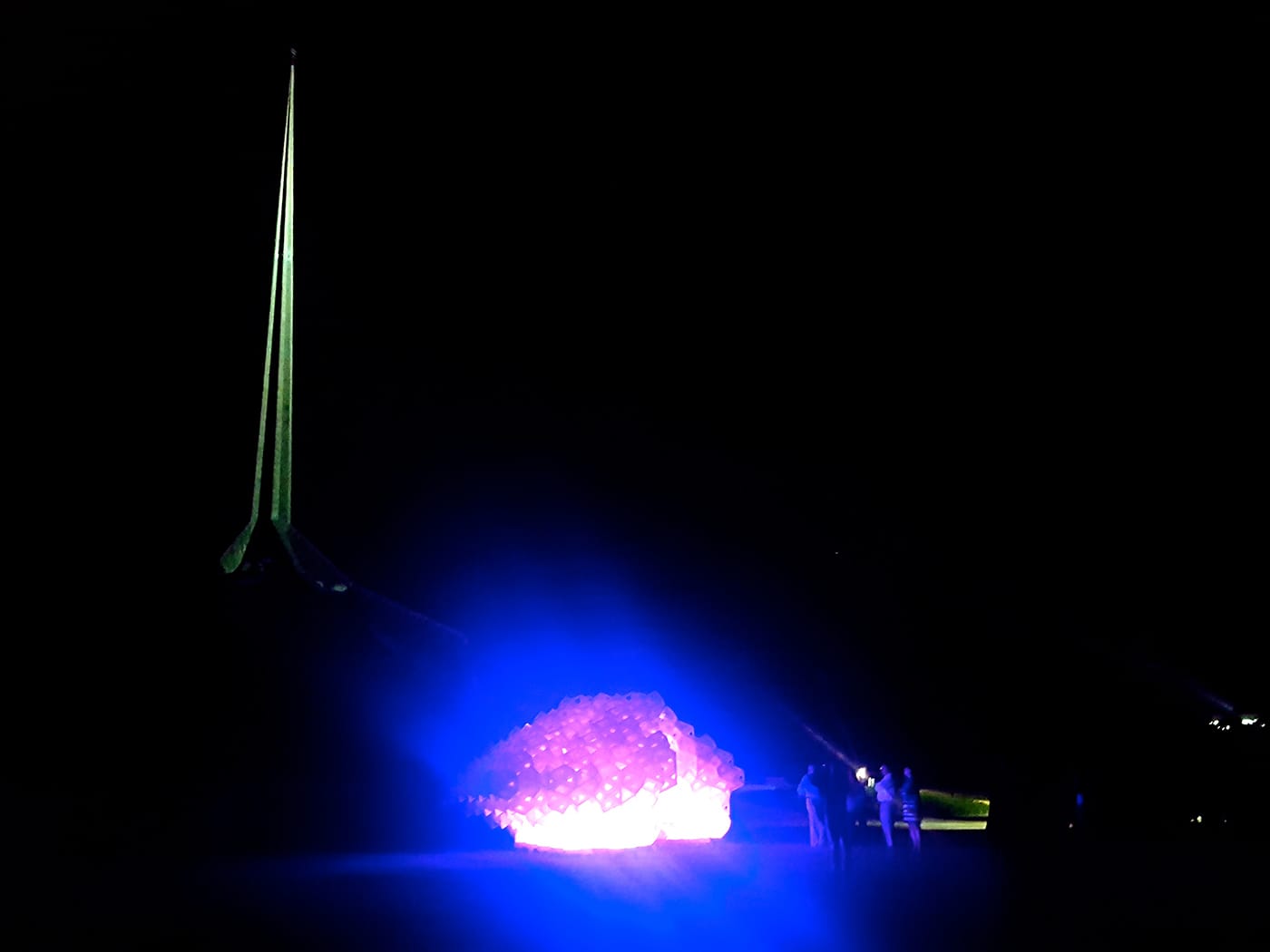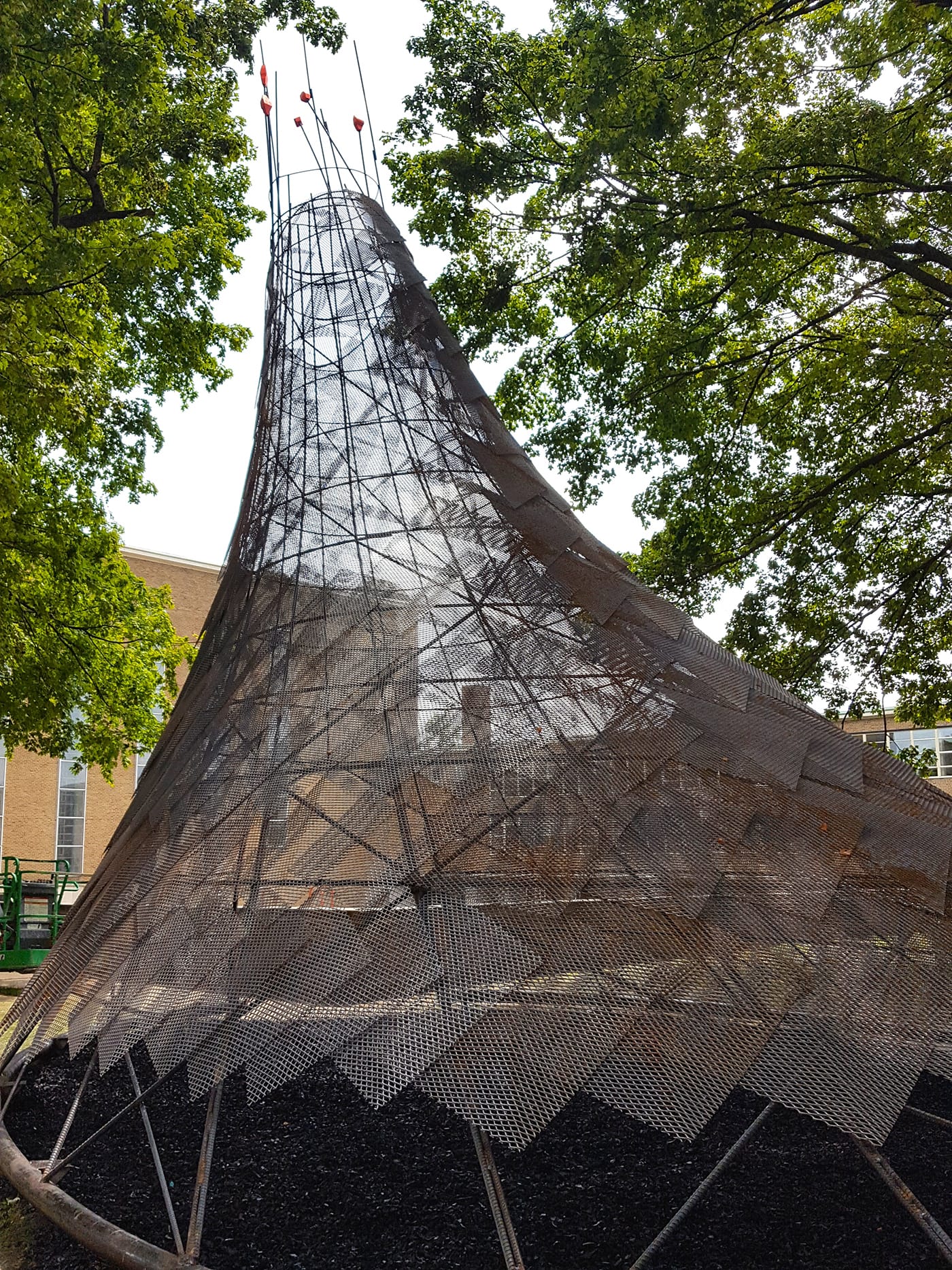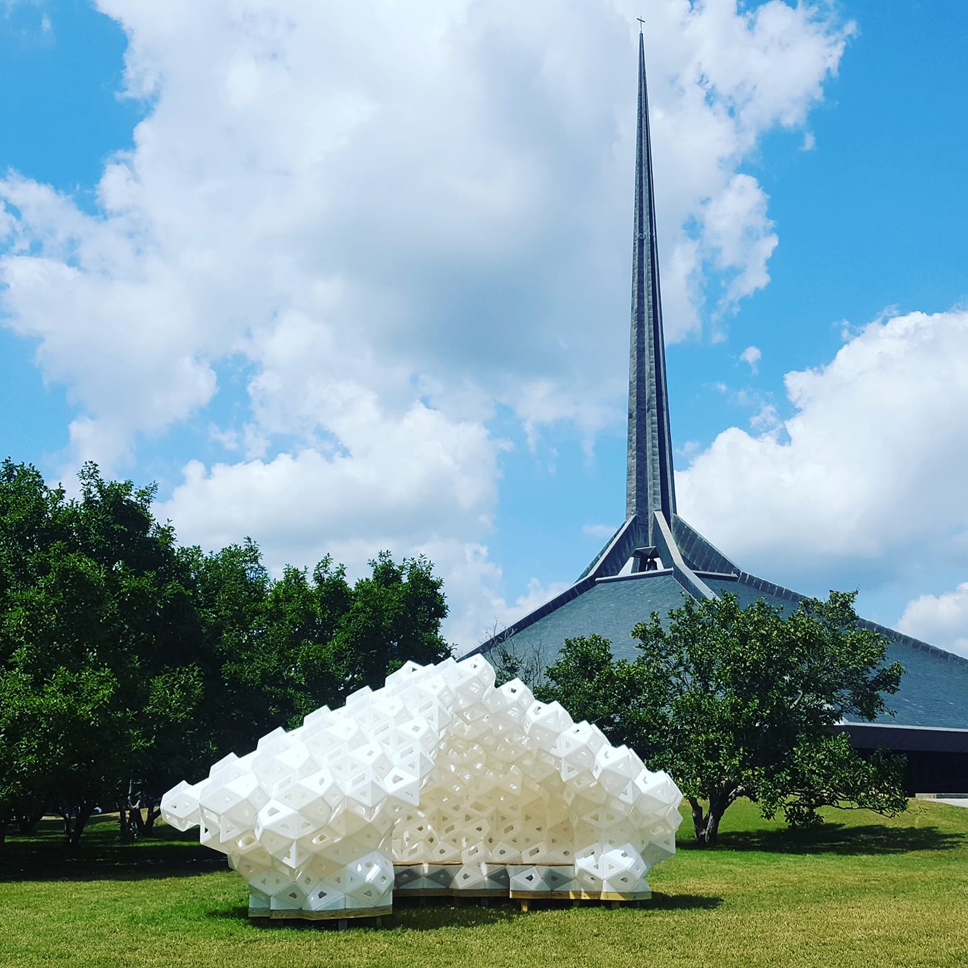 Synergia, by students of the Indiana University School of Art + Design, supervised by Jianmei Wu and Andres Tovar, outside North Christian Church, the 1964 final work of master architect Eero Saarinen (all images by the author for Hyperallergic)