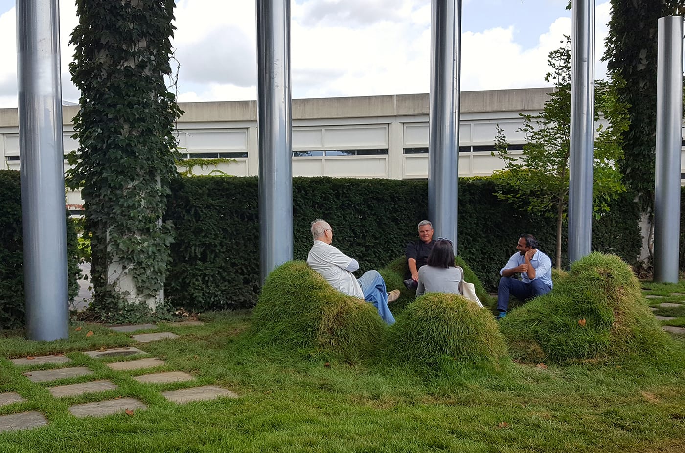 Outside the Cummins Corporate Office Building — a sprawling campus that houses the city’s major employer, a powerhouse of industrial manufacturing and design, responsible for the wealth behind many of the Millers’ pet design projects  — is Anything can happen in the woods, a series of grass seating mounds in clusters, by Plan B Architecture & Urbanism. Obviously, being grass mounds, these were rubbish for skating, and I had just taken a break in the park, so I kept it moving, but I did notice a number of Cummins employees holding court on the mounds.