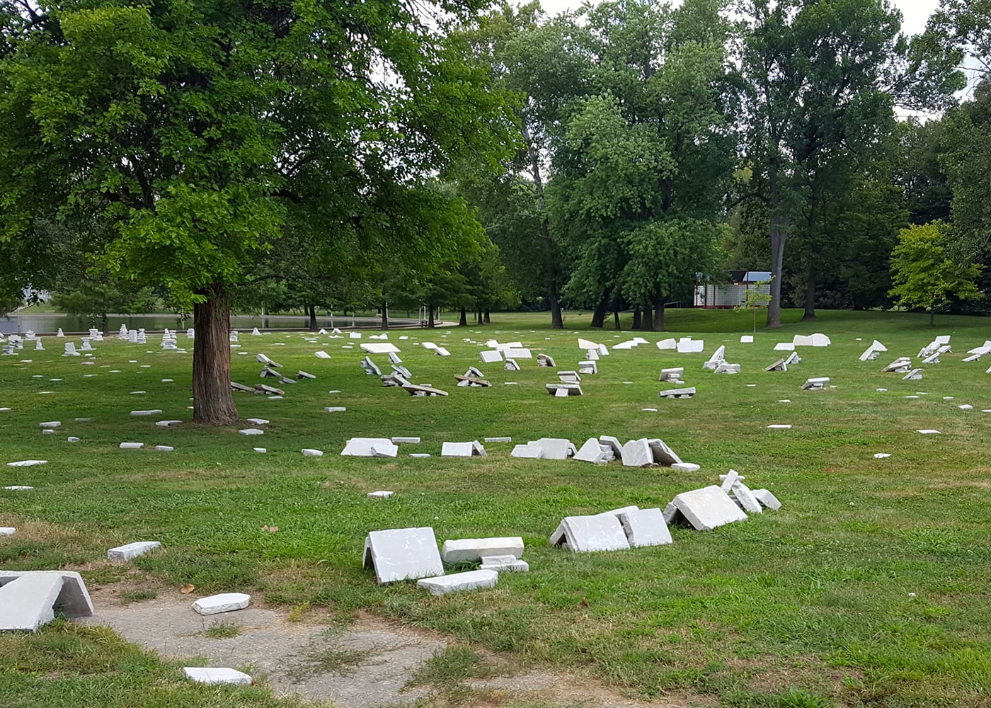First up, Another Circle by Aranda/Lash, in Mill Race Park. The installation strews an expanse of the park, flanked by a large pond and bisected by a roadway, with broken bits of native limestone, sourced from discard piles from a nearby quarry. These are arranged in the vague suggestion of purposive use —classroom, theater, table — and resemble ancient ruins, and also, with white slabs on grass, a graveyard. Being on grass, I could not build any kind of momentum, but some of the pieces lodged at sharp angles enabled me to practice banking, and were also good for leaning against to take a break.