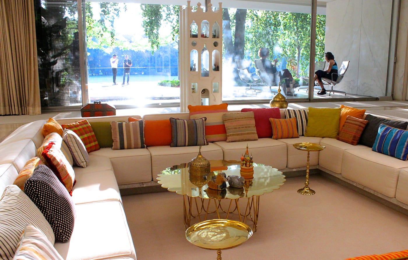 Columbus’s history of design includes multiple constructions by venerated architect Eero Saarinen, who was responsible for the trendsetting residence of Columbus’ most influential couple, J. Irwin and Xenia Miller, as well as the nearby Irwin Union Bank, and eventually North Christian Church, the first church in the country with a Modernist design. (It was also Saarinen’s final work, due to his untimely passing at the age of 51.) The interior of the Miller House was designed and outfitted stem-to-stern by Alexander Girard, an architect, curator, and interior designer who is enjoying more popular recognition lately, thanks to his foundational work and collaborative influence on other big names in midcentury Modern interiors, like Herman Miller and Charles and Ray Eames. Recently, in a review of the Girard retrospective and symposium at Cranbrook Art Museum (which I fortuitously attended mere weeks before Exhibit Columbus), I grappled with a sense of colonialism in Girard’s work, and a sense of Modernist design as preclusive to the real action of life, in general. My sense is that the clean modular nature of some of Girard’s favorite interior design infrastructure, such as the shadowbox and the shelving-wall, act as a kind of pasteurization field, capturing the folk art that was growing wild in then-largely untraveled corners of the world into tidy, controlled boxes — a kind of hermetic art-zoo. Having seen his astonishing interior in context, preserved as a national historic landmark in the Miller House, I must revise my thinking to attest to the warmth and comfort of Girard’s custom efforts on behalf of the Millers; no detail is left unattended. The house is full of once state-of-the-art systems and clever details that accommodate the lives lived there, but it also provides no shortage of bucolic vistas and places to lounge fashionably in conversation attendant to upper class leisure (including, of course, Girard’s signature “conversation pit” in the living room).