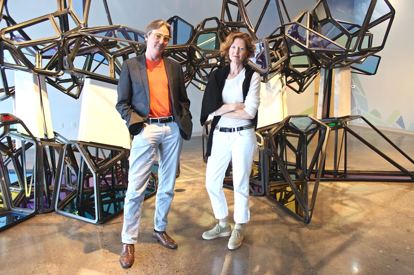 T. Kelly Wilson (left), J. Irwin and Xenia S. Miller Prize Coordinator for Exhibit Columbus, with collaborator Jennifer Riley (right) at IUCA+D, with their sculptural project, The Shadow of an Unknown Bird – one of the largest 3D printed works of art in the world.