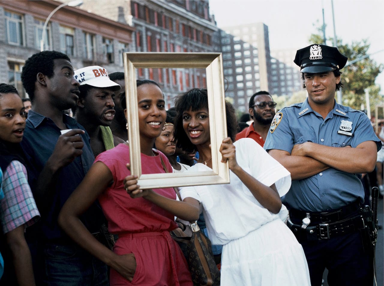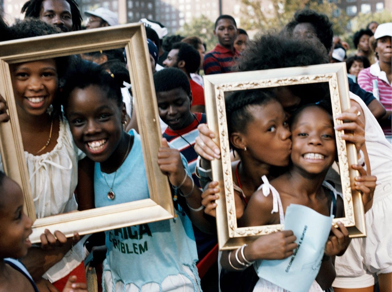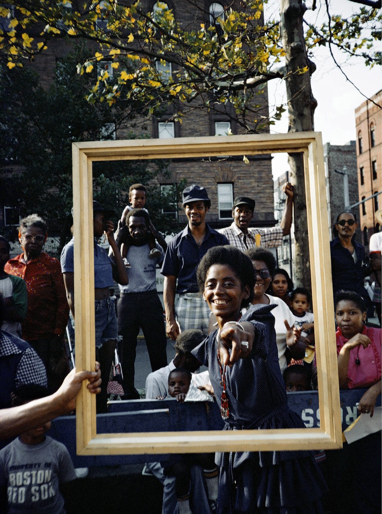 For the performance, O’Grady entered a float into that year’s African-American Day Parade, which ran, and still runs, up Adam Clayton Powell Boulevard in Harlem. On the side of the float, in big letters, were the words “ART IS…”; atop it, running lengthwise, was a massive 9’x15’ gold picture frame. In character as “Mlle Bourgeoise Noire,” a persona she had adopted, in the years prior, as a guise enabling her to crash art world events and draw attention to issues of racial underrepresentation, O’Grady and a troupe of 15 African-American and Latino performers, dressed all in white, walked around the float carrying empty gold picture frames. The empty frames were sometimes handed to onlookers, sometimes held in front of them, Vanna White-style, to encourage the mostly black audience to consider themselves as valid subjects, even makers, of art. Photographs taken by various people who witnessed these framings were then collected by O’Grady to document the performance. Forty of those images are currently on view in an eponymous exhibit of “Art Is…” at the Studio Museum in Harlem. The results are smart and exuberant, a delightful Conceptualist triumph of both head and heart.