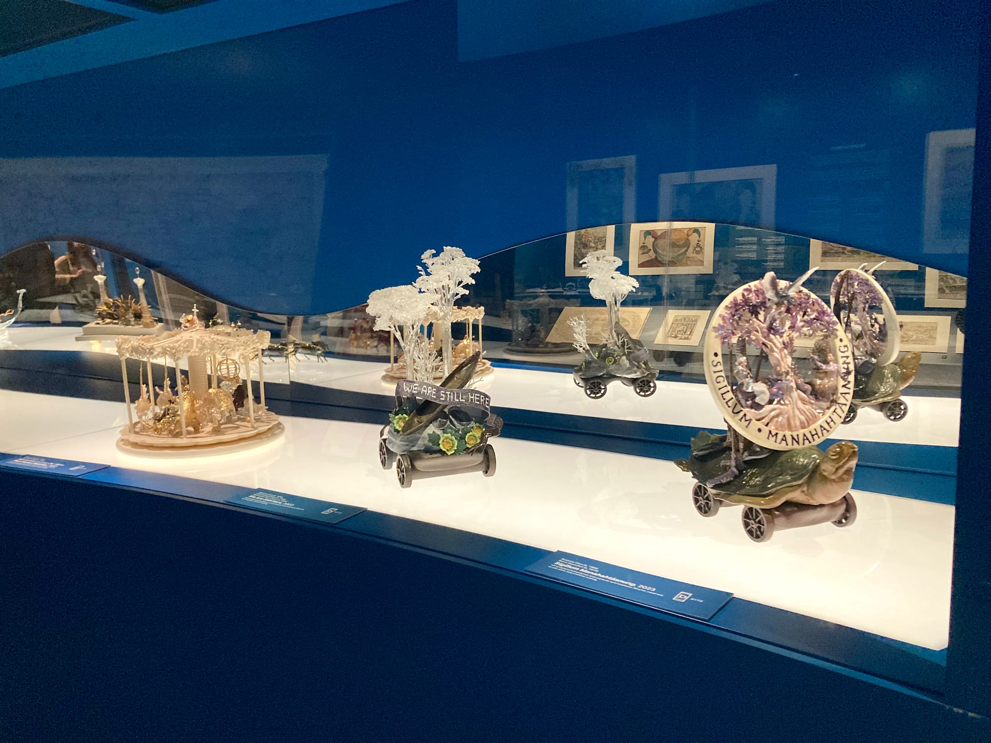 It’s a smart, manageable choice for a broad theme. She draws heavily on the archive of the 1909 Hudson-Fulton Celebration, which marked the 300th anniversary of Henry Hudson’s voyage up his namesake river and the 100th anniversary of Robert Fulton recreating it. Referencing the parade floats and tableaux made for the two-week celebration, Glow, with collaborators of Dutch, Indigenous, and African heritage, created extravagant parade floats that update and reframe this colonial history. She uses VR technologies to make these floats and produces them with 3D printers, resulting in highly detailed plastic polymer sculptures. These artworks are fun: “Revolutions to Love Our More-Than-Human Relatives,” made with NYC-based Matinecock artist Tecumseh Ceaser, turns Renaissance allegories of the Four Continents into a carousel, reducing the colonial stereotypes of America, Africa, Asia, and Europe to absurd and childlike amusements.