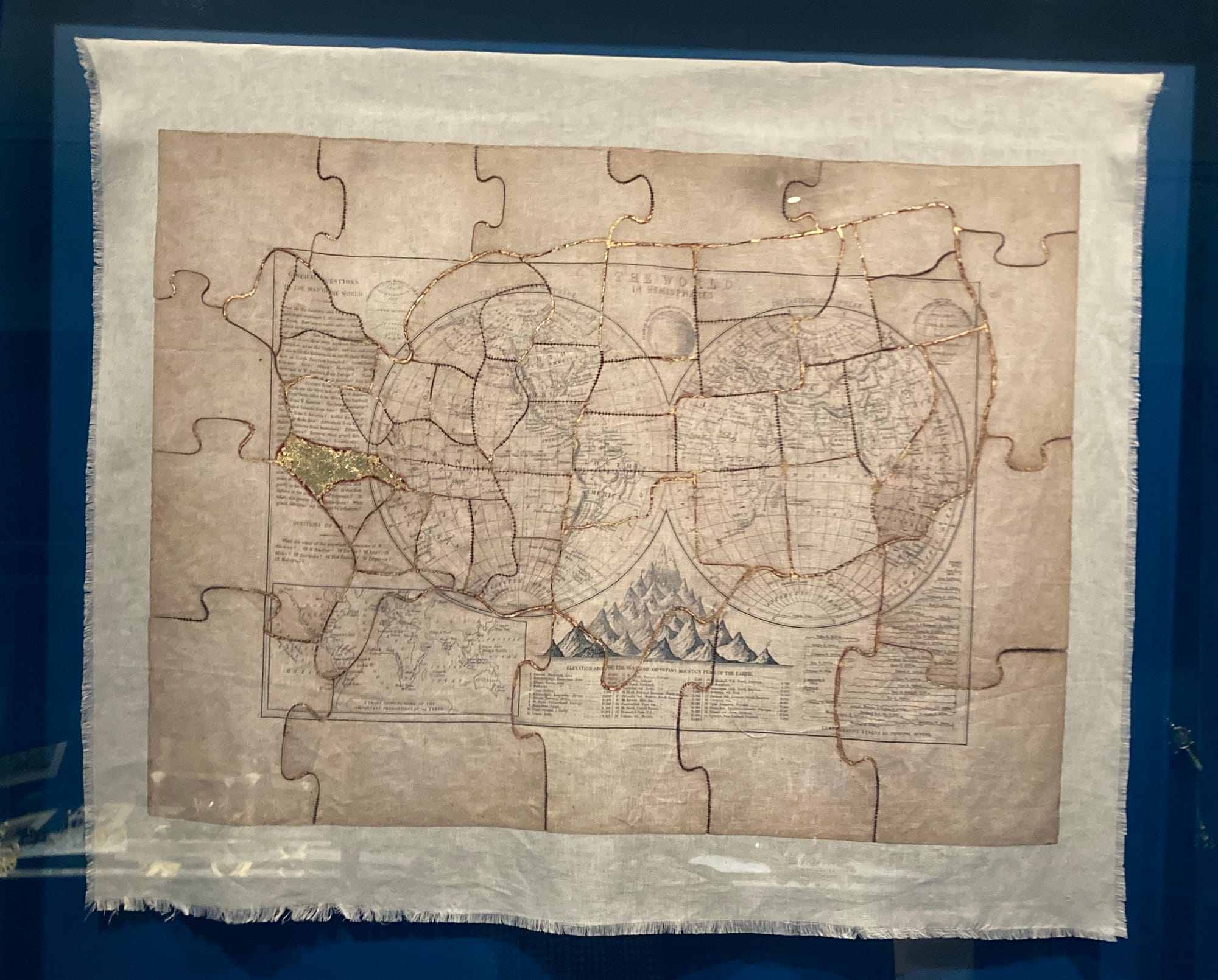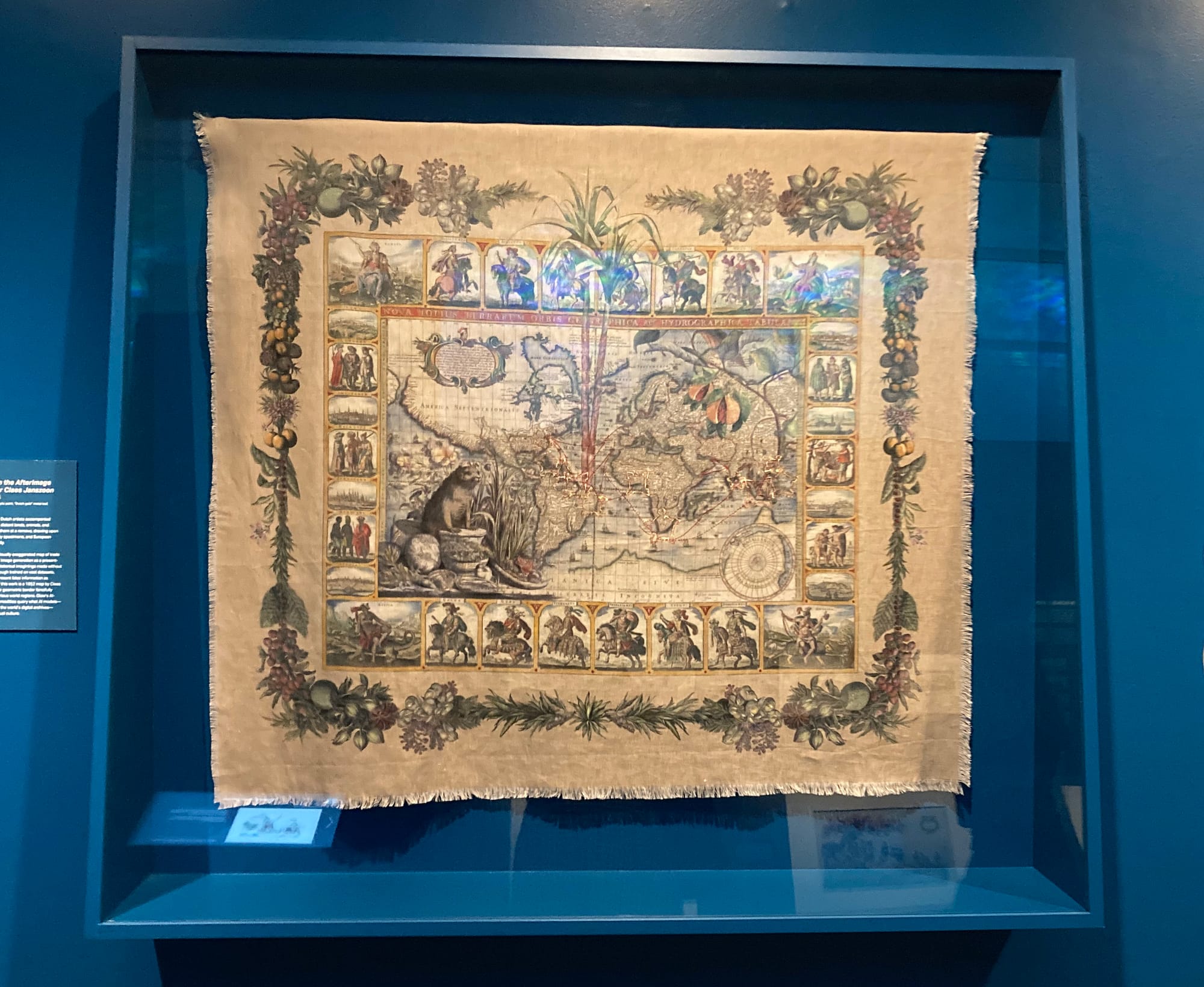 Glow also makes use of AI in “Hallucinating in the Afterimage of Empire (after Claes Janszoon Visscher),” overlaying a 1652 map with generated images of Dutch colonial exports. The comparison between the almost-real weirdness of machine-generated images and the fantastical illustrations on early modern maps is self-consciously witty: Just as the maps' original decorations reveal their author’s prejudices and assumptions, the AI model can only repeat the colonial sources that it’s been trained on. Frustratingly, it’s not that easy to see how implausible the “hallucinations” of the AI illustrations actually are, between the distortion of the fabric it’s printed on and the reflection on the glass. But putting any reservations about the ethics of AI image making aside, it’s a cunning way to draw a parallel between the experimental technologies of the past and those of today, as the work gently nudges the viewer to consider the connections between technology and colonialism.