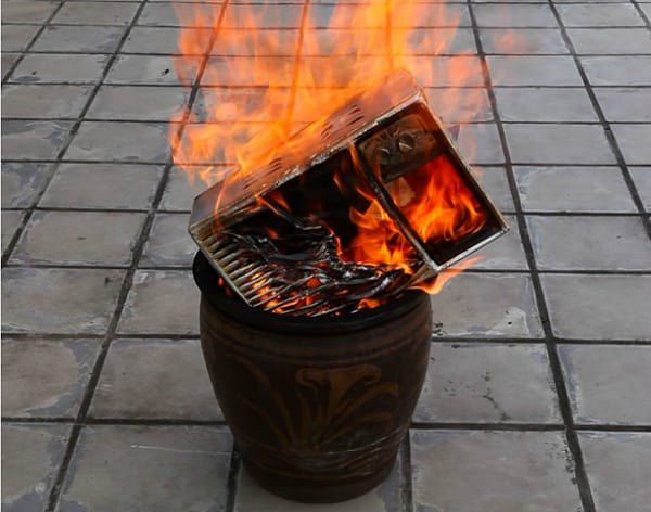 All of the photographed objects were burned by Tong as an offering to his ancestors, and a video of the ritual is playing behind the front desk in Jen Bekman Gallery. (You can also watch it online.) Called “With love, from Earth to Heaven,” it is mesmerizing to watch the vibrant objects whither and flame away to ash. (I recommend turning down the distracting piano music and watching it in silence for the full effect.) There is a touching hope in the burning of the objects, hope that death can be something more wonderful than tragic. We all hope that people we have lost are in a better place, in a paradise where they can have what they want, even if it was something as simple as a plate of sushi.