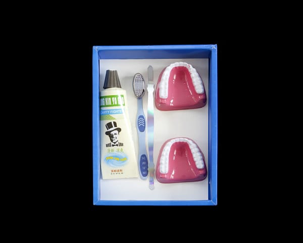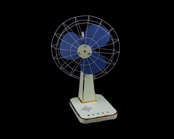 The objects are all in cartoonish colors and a little absurd. While it is totally understandable why you’d want to equip your relatives with a mansion with a doorman, a Ferrari with a chauffeur and a machine gun in the netherworld, many of the objects are mundane. There’s a window air conditioning unit for your afterlife apartment (how depressing to think that even in death you will have to live without central air conditioning), and an umbrella in case it rains in heaven, per the exhibition title. Dentures and wheelchairs are practical offerings in case your ills and worldly pains are carried over to your next state.