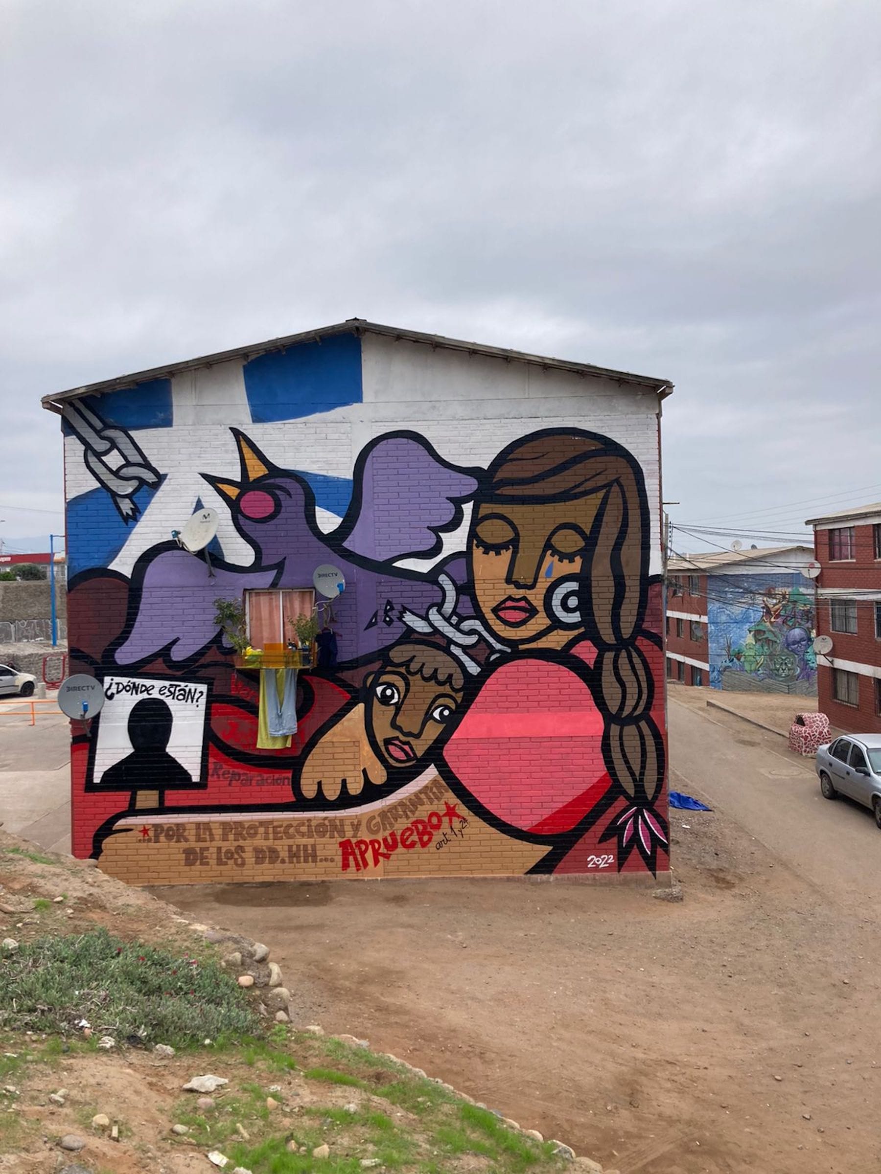 The new constitution also called for gender parity in government representation, reflected in Francisco Maltez's (Koshayuyo) mural "Por La no discriminación de GÉNERO Y DISIDENCIAS SEXUALES," and made sweeping provisions for guaranteed access to healthcare and housing; significantly, it would have also fully legalized abortion in Chile, where the procedure is currently only available to women whose life was in danger, when a fetus is unviable, or when a pregnancy results from rape. In La Serena, artist collective Brigada Ramona Parra painted the side of a brick building with a mural advocating for universal human rights; the bottom left corner of the composition depicts a picket sign with the question "¿Dónde están?" — "Where are they?" — a reference to the disappeared victims of the dictatorship of Augusto Pinochet.