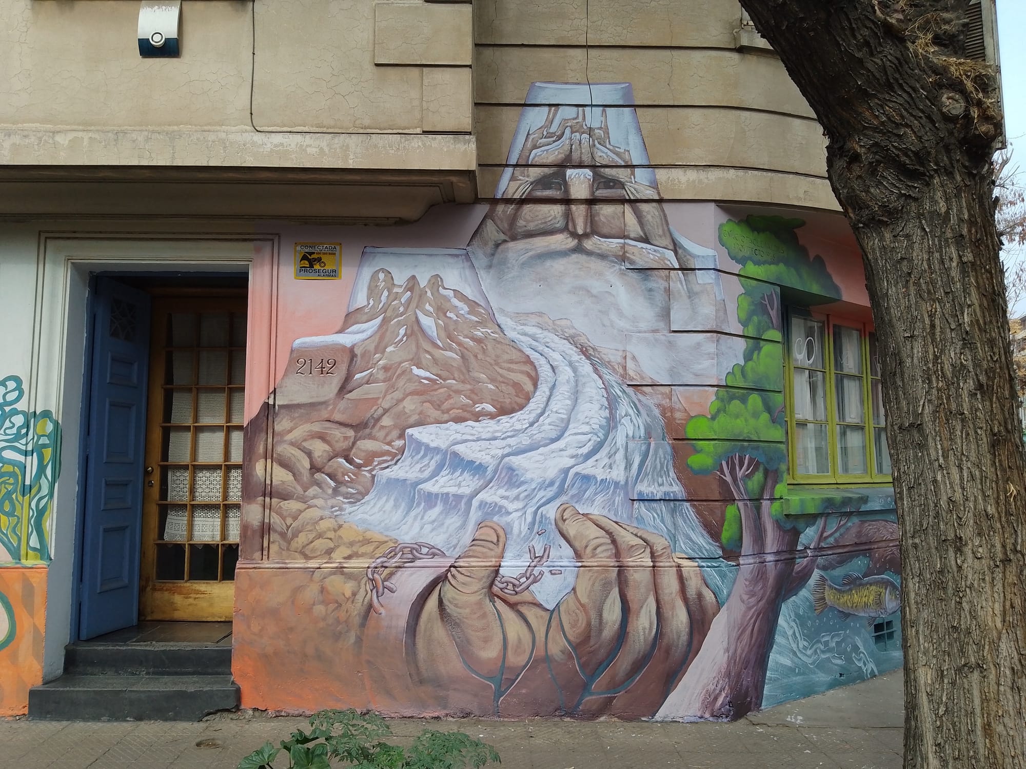 Over the last 13 years, more than half of Chile's population of 19 million has been subjected to water scarcity as the country has experienced unprecedented drought. In the República neighborhood of Santiago, artist Mario Moreno (Sofrenia) reflected on the importance of water, depicting the water cycle and humans' relationship with it in his mural "Por el derecho al AGUA."