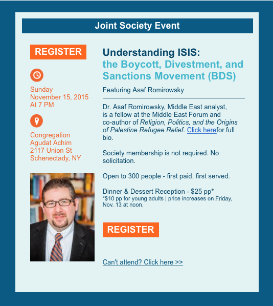 Since the Hyperallergic exchange, an unbridled, vitriolic, and alarming campaign has been launched against BDS. Anti-BDS rhetoric came in the way of a commitment letter written to the Forward on November 4, 2015 by Hilary Clinton. She reinforces her commitment to work with Israel and against BDS because it threatens Israel’s existence. Several events have taken place at various synagogues, among them Agudat Achim in Schenectady, NY, where Dr. Asaf Romirowsky was invited to discus his book on November 15, 2015, in an event called “Understanding ISIS: the Boycott, Divestment and Sanctions Movement.” The most recent vitriolic and bizarre event took place at a the Jewish Academy in San Diego, where Black South Africans Jamie Mithi and Khanyisa Pinini were brought in to prove that the Occupation in the West Bank and Gaza do not amount to Apartheid. These events employ the “big lie” tactic. It is not new for supporters of Israel to create fiction. The justification and reasons trotted out over the last 70 years have all been part of this strategy. However, the new fiction shifts a bit, because it operates in the realm of dangerous fantasy against a peaceful movement that is comprised of a large number of Jews and Israelis.