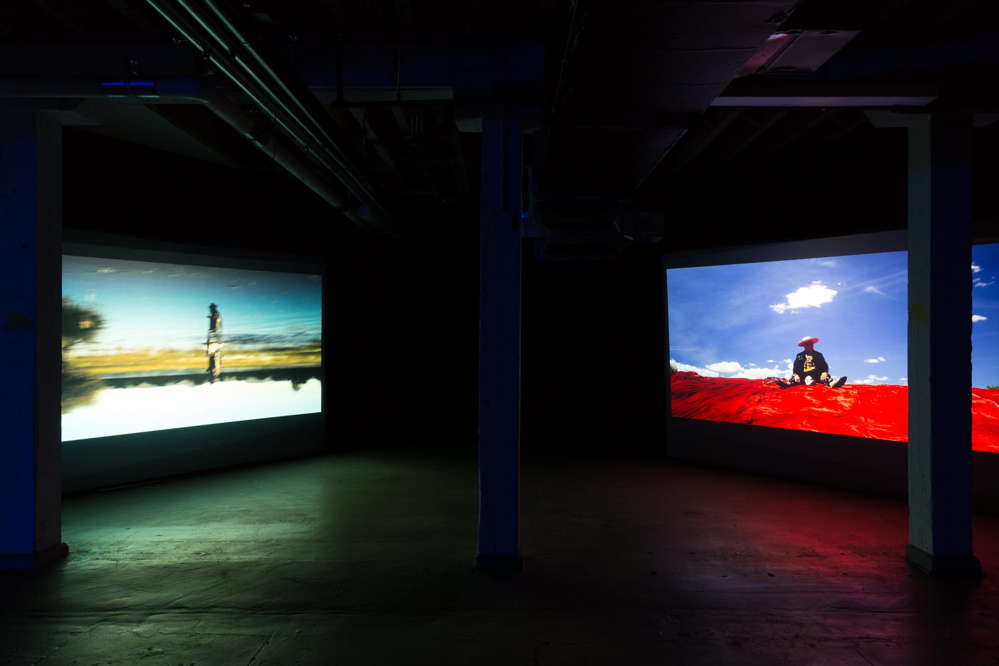 Winger-Bearskin’s combination of artificial intelligence, glitchy visuals, and poetic text conjures imagined worlds atop earthly landscapes in another set of videos, while Trujillo, who grew up in the rural outskirts of Zacatecas, Mexico, reclaims his previously hidden queer identity in “El Viejo”; the work follows a dancing old man, draped in red velvet, bells, and ribbons, through a dry ranch landscape.