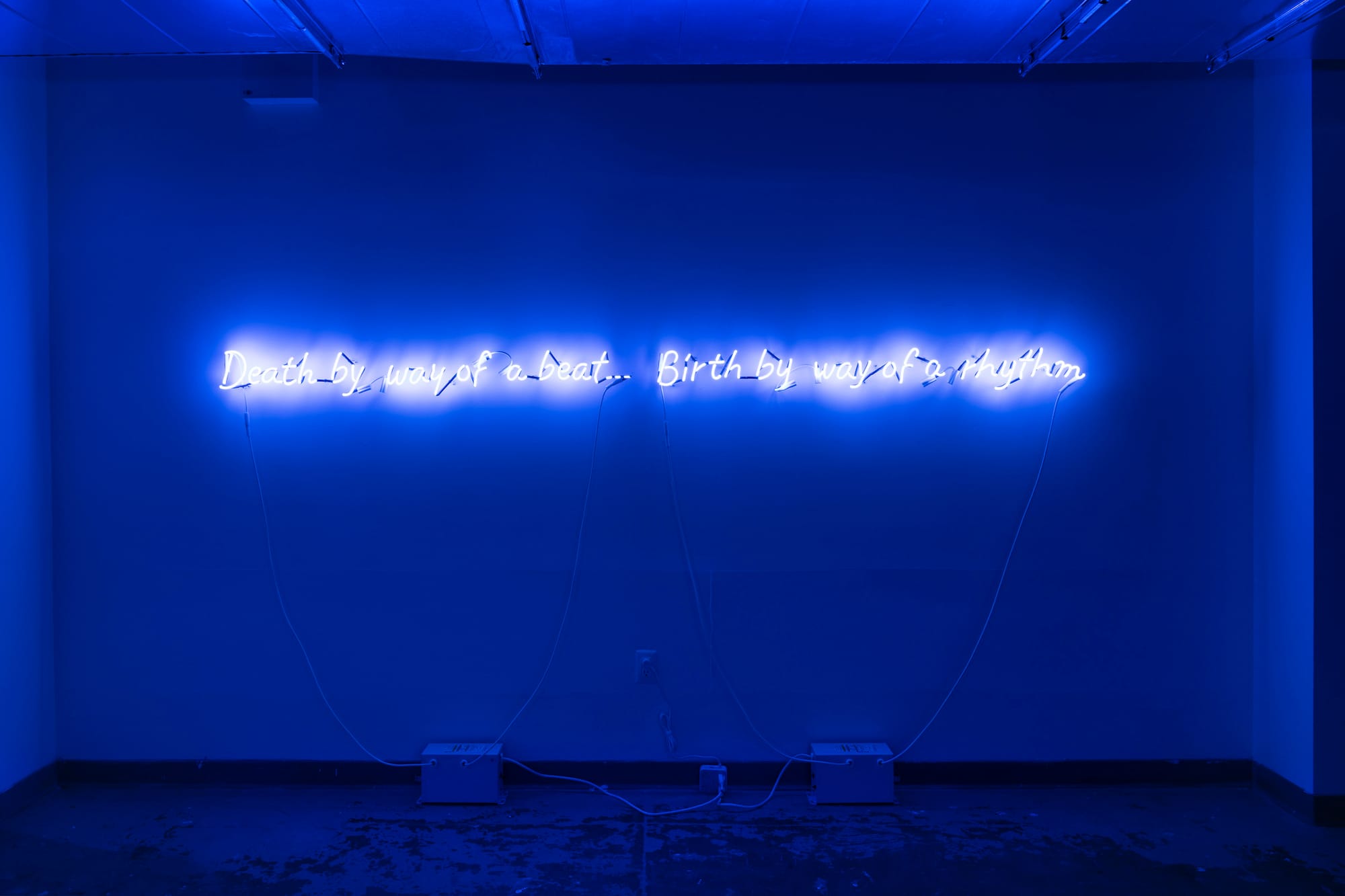 In “The Kiss of the Rabbit God” (2019), Huang weaves together themes of queerness, spirituality, and folklore. The 14-minute short film is a revelatory story of an exhausted Chinese-American service worker who is seduced by a red-haired god from the Qing Dynasty. LeSeur's three-channel video “Superwoman” (2018) chronicles a self-baptism to the melody of Donny Hathaway’s cover of Stevie Wonder’s “Superwoman” (1972). The video honors Black queer femininity and the importance of self-love in times of internal struggle and transition. The artist's work continues in a curtained-off alcove illuminated in cobalt by a multimedia installation. In a single-channel video titled “In Reverence (An Honoring)” (2018) on the middle wall, open palms bathed in golden sunlight reach upward into a clear blue sky. On the side walls, neon signs read, “Death by way of a beat … birth by way of a rhythm” and “Freedom like a breath … all blue” (both works 2023), conjuring themes of death, visibility, and transcendence.