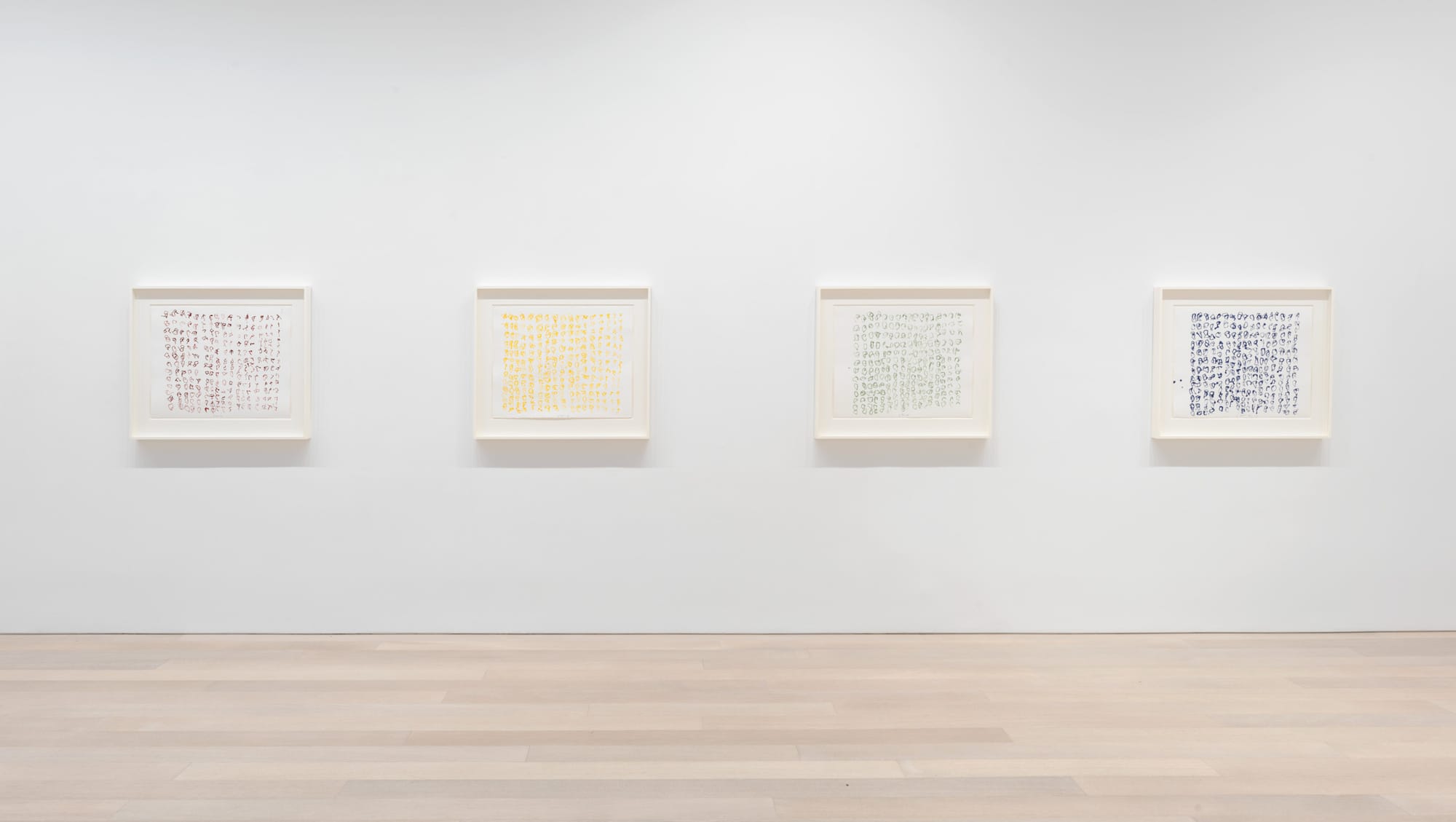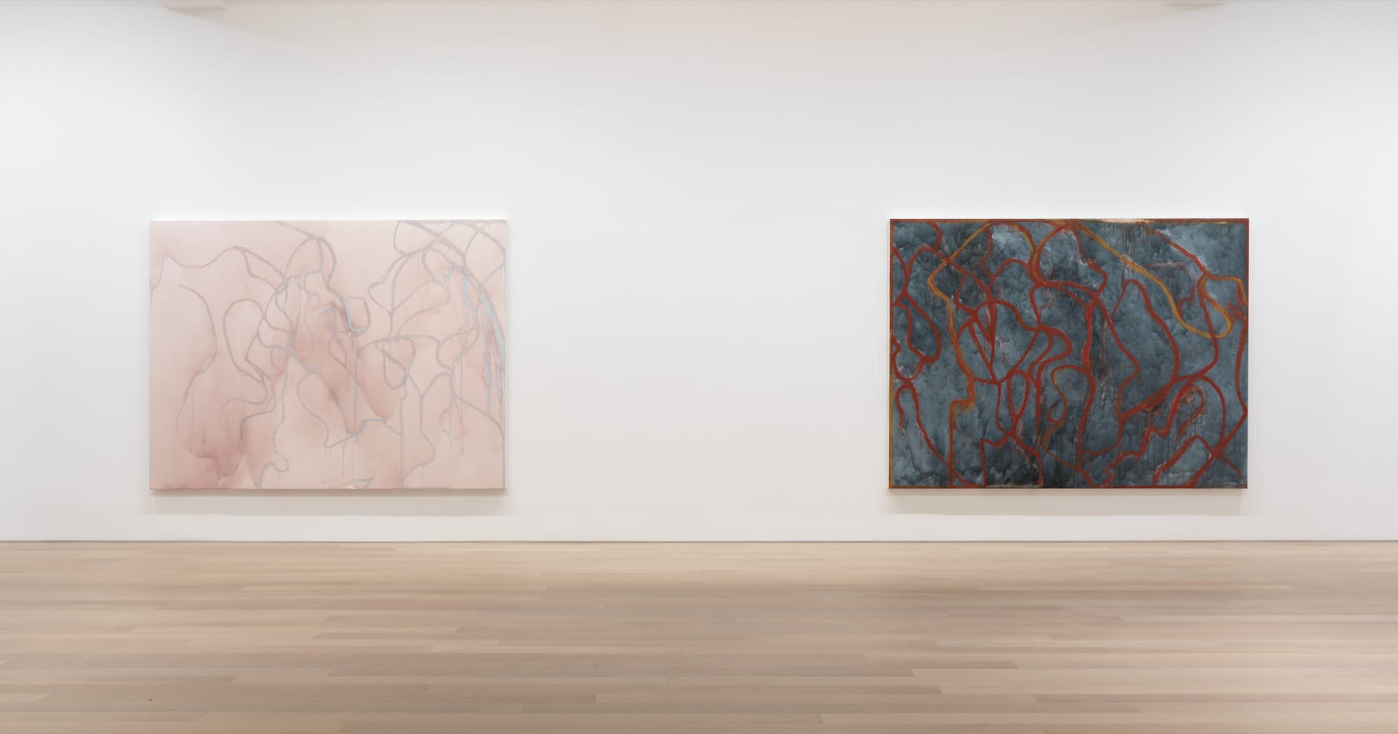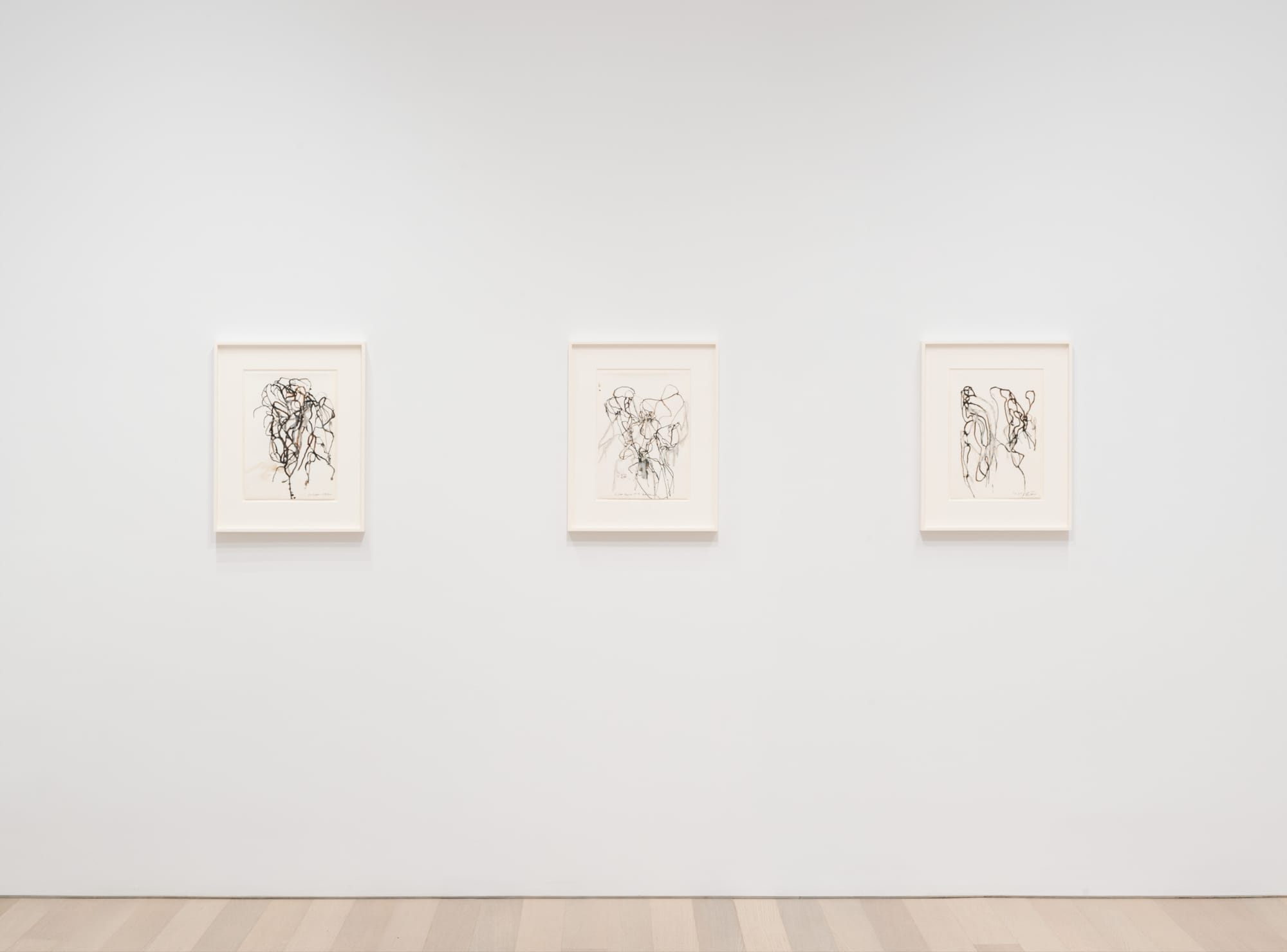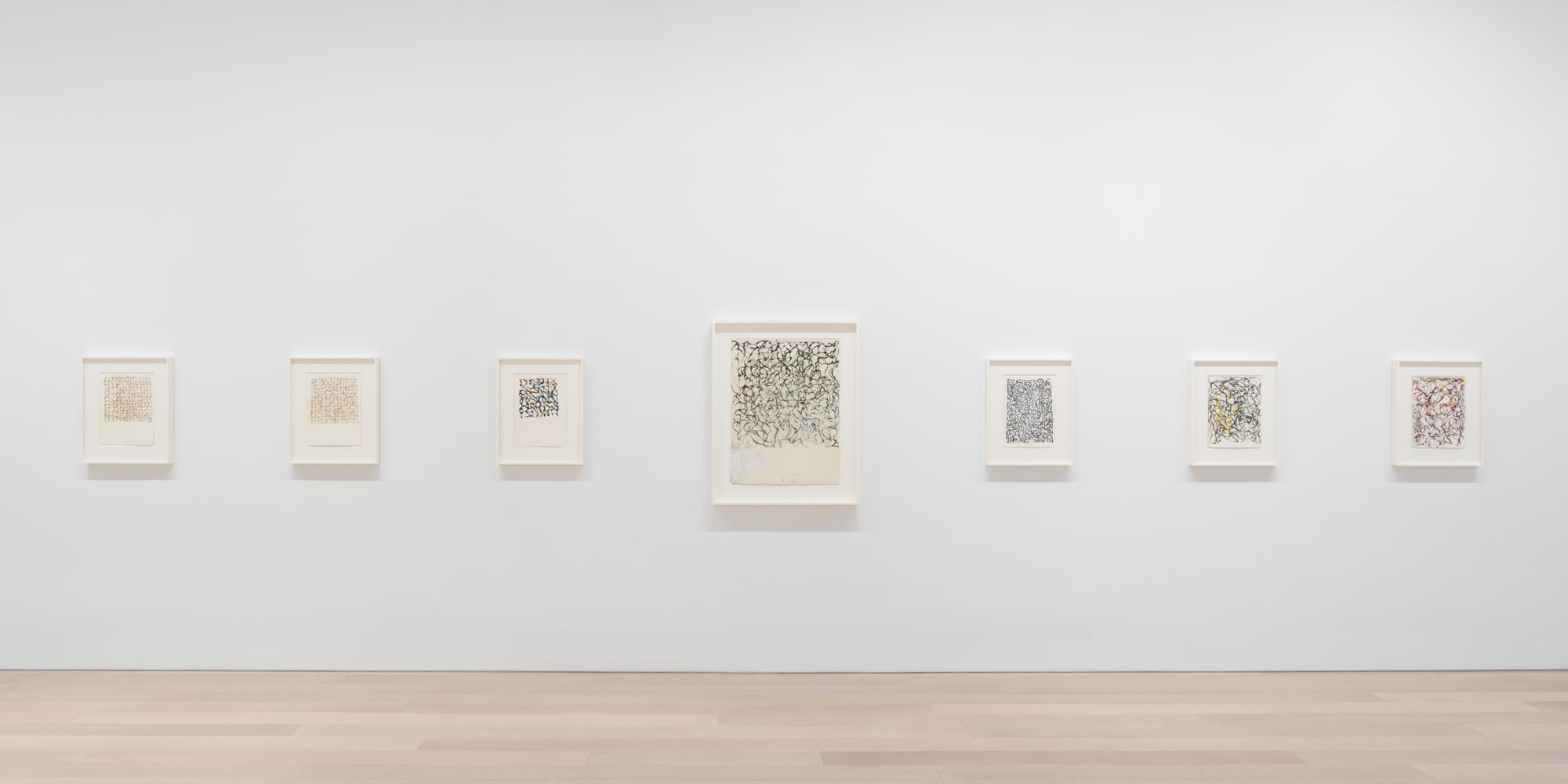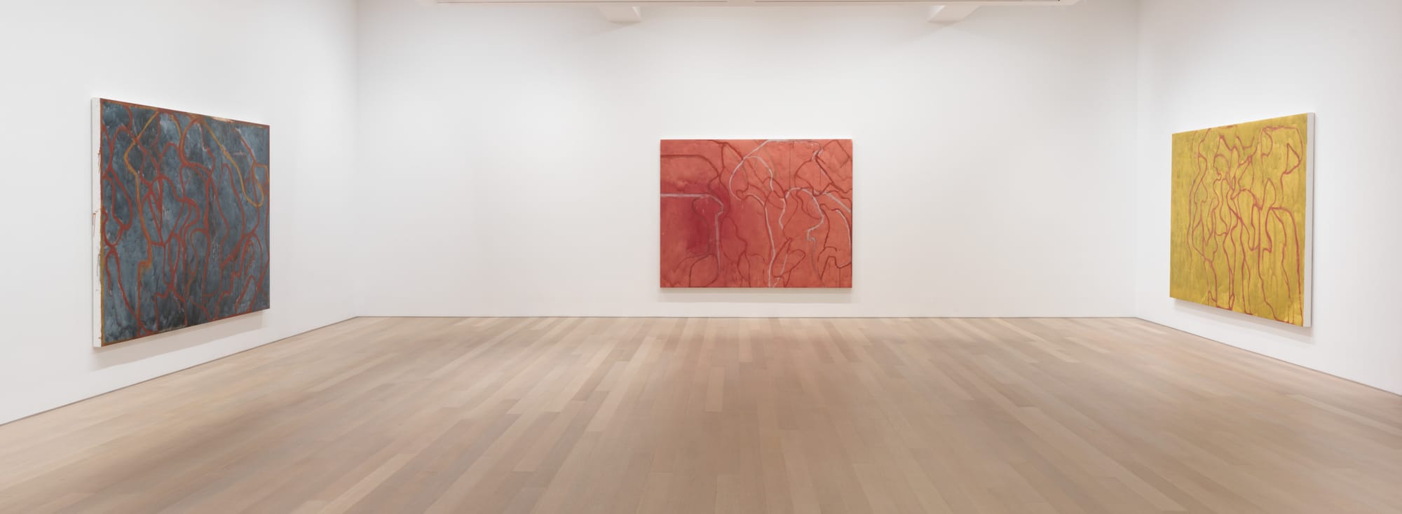 Dated between 2020 and 2023, the artworks in Brice Marden: Let the painting make you at Gagosian are the artist’s final ones. In 2017, Marden, who died this August at the age of 84, learned that he had rectal cancer. When asked about this, he told the New York Times in 2019, "[it] hasn't made me work any differently. It's just an extra thing to think about." Marden, who has often been credited with rejuvenating painting in the mid-1960s, knew that painting and drawing were physical acts for him, the result of movements made by the hand, wrist, arm, and active body. More than 30 years ago, in a prescient interview with the artist Pat Steir printed in a brochure for the 1991–1992 exhibition Brice Marden: Cold Mountain at Dia Chelsea, Marden stated: "I am 5’8 1/2", and I weigh this much, and I am left handed, and I’m a certain age. That has a big effect on what a thing looks like. The kind of mark I can make physically."