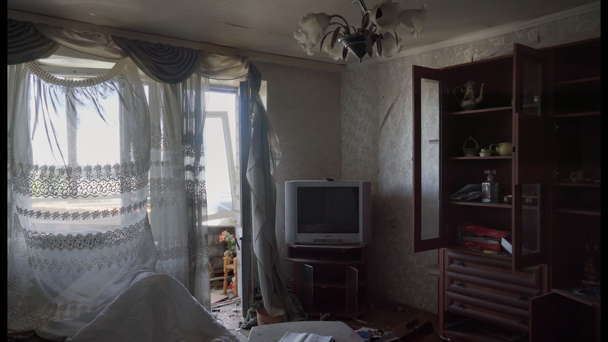 Intercepted posits a twinned dialectic between sound and image and between invader and invaded. Ukrainians are represented through what is seen, Russians through what is said. The tableaus are nearly always long, still takes, with the exception of some panning shots, and usually do not feature human figures. There’s a recurrent motif of curtains blowing in otherwise static scenes — blasted-out kitchens, classrooms, and living rooms in eerie post-traumatic repose. And there is often an ironic counterpoint between the phone calls and the scenes they overlay. In one shot, for instance, a man smokes in a kitchen and simply stares out the window, performing one of the most mundane acts one can think of. In the overlaid audio, however, a Russian soldier claims to the woman he’s calling (most likely his mother) that whenever he and his squad mates rough up Ukrainian civilians, they don’t express any pain, dehumanizing them.