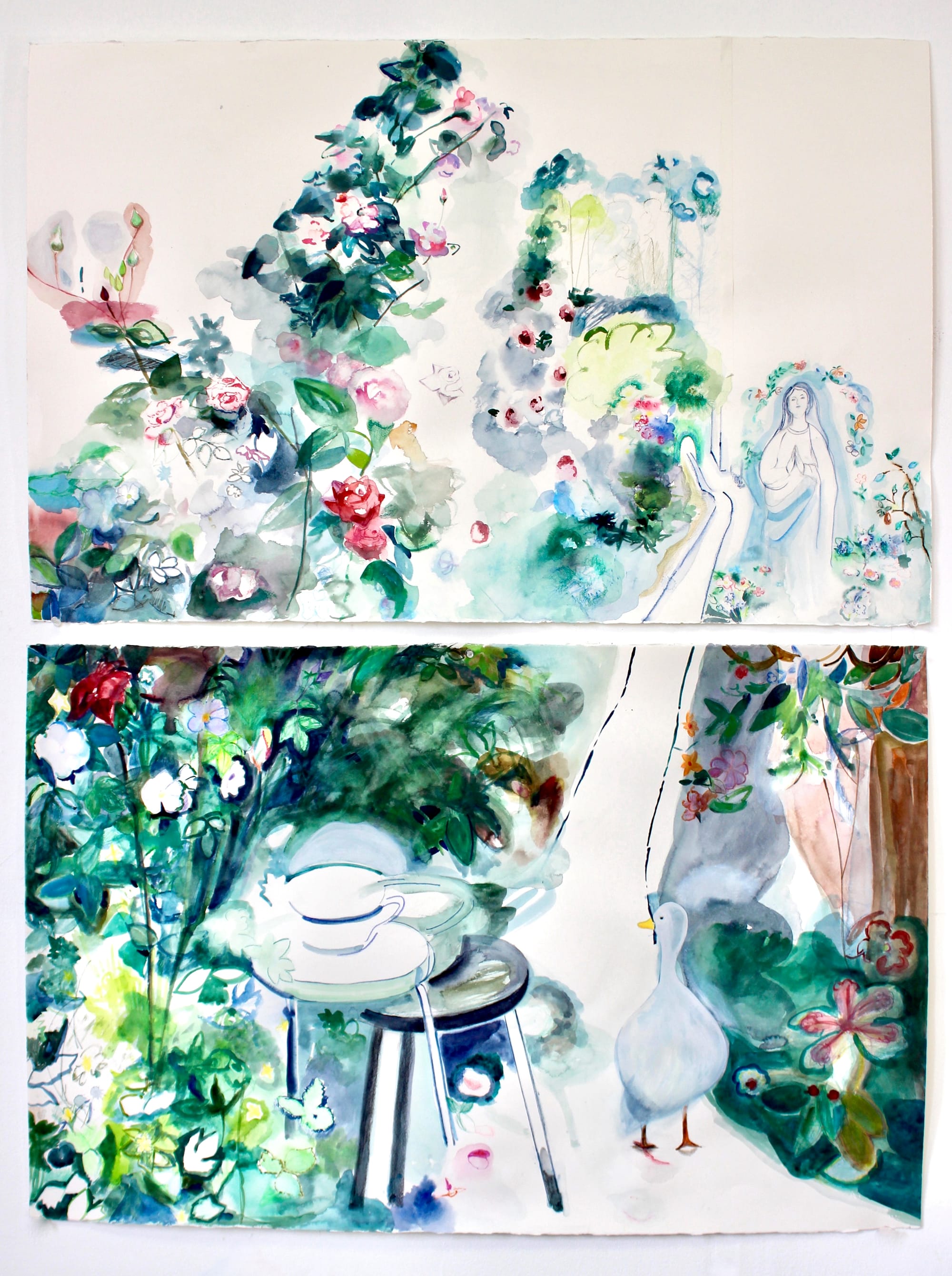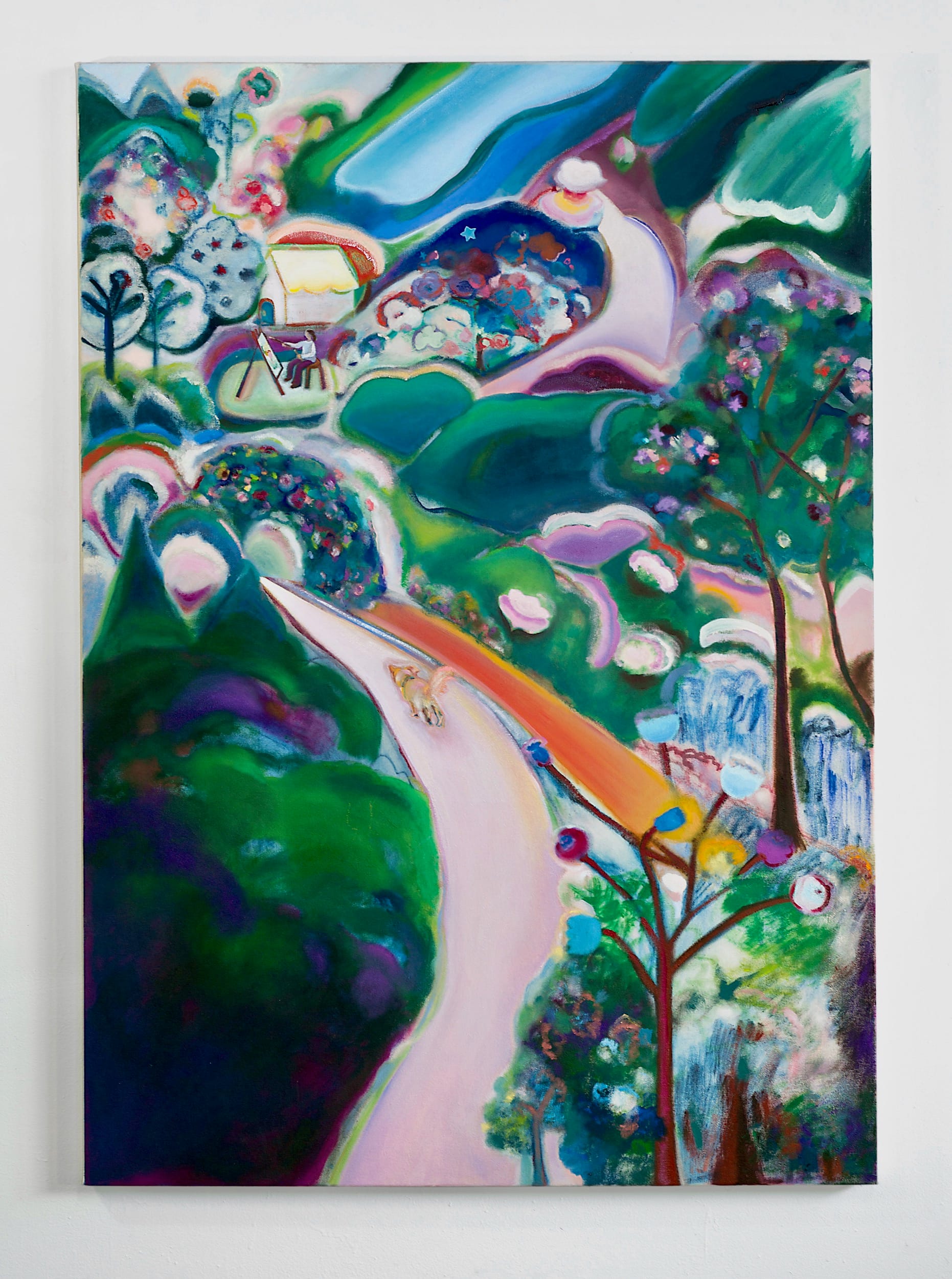 Left: In Kyoung Chun, “Scented Creek Near My Place” (2023), watercolor and oil on canvas, 52 x 36 inches; Center: “Mirrored House” (2023), oil on canvas and Plexiglass, 18 x 18 x 3 inchesRight: “Narrow Path” (2025), watercolor on paper, 56 x 43 inches