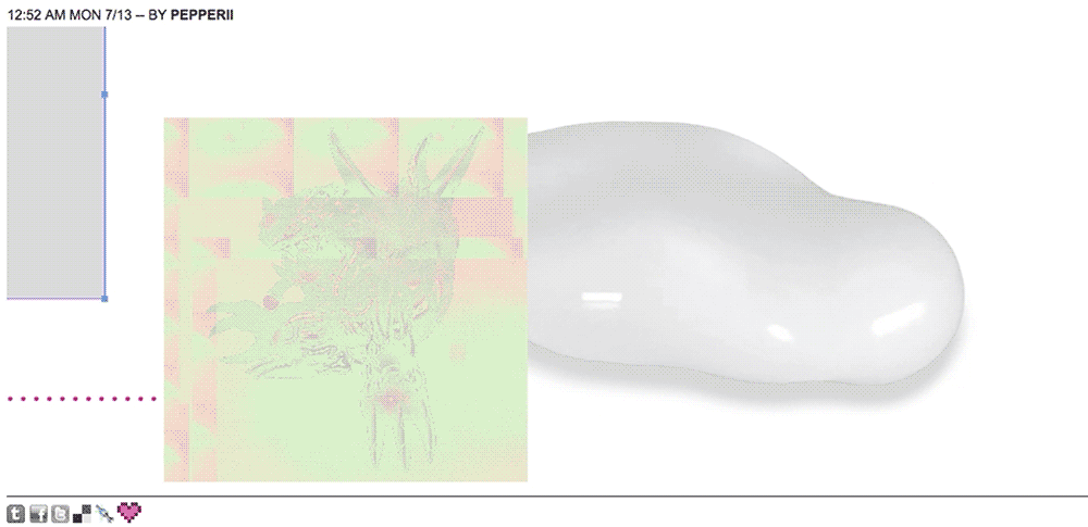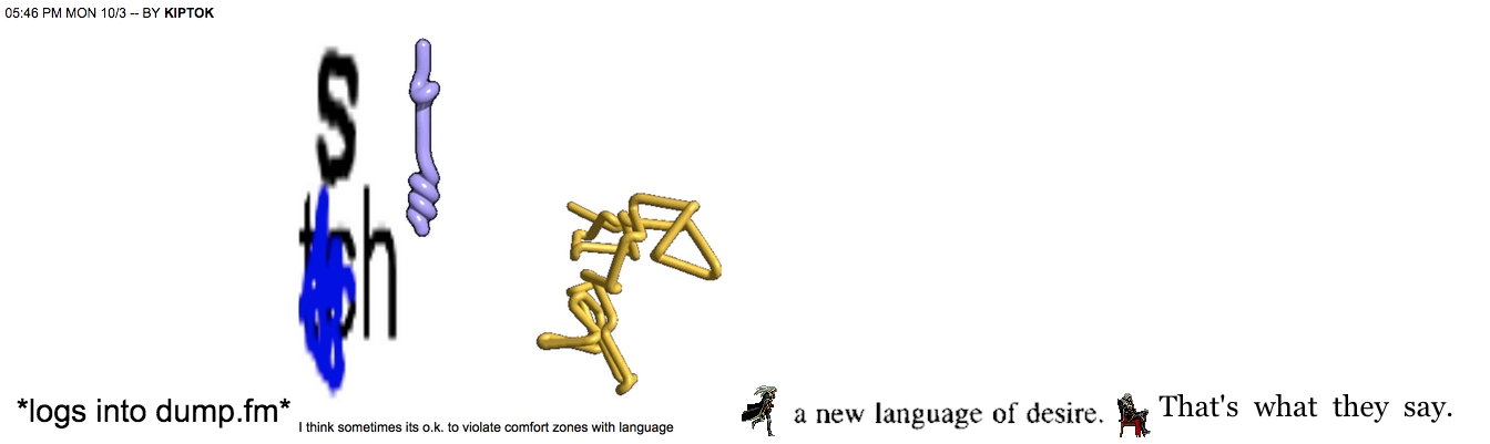 Dump.fm was a real-time imaging sharing site that took its cue from the transmissional aesthetics of radio, perhaps ham radio in particular. Since its inception in 2010, the ragtag group of amateurs and auteurs of digital junk space who participated fulfilled the site’s mission of “talking with images” by adding these images to a single chat stream, much as one would add multiple mixing channels to a single broadcast mix. The gifs, pngs, and jpgs inevitably became spliced, remixed, broken, minced, enlarged, interlinked, and eroded, elaborately arranged in gif altars or parsed into animated rebuses by the site’s semi-anonymous users.
