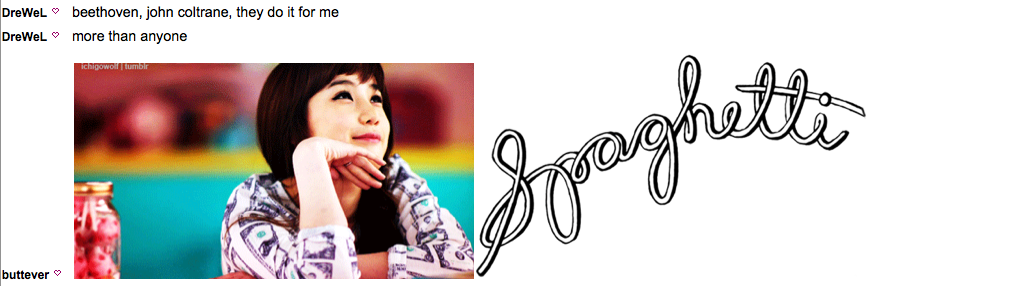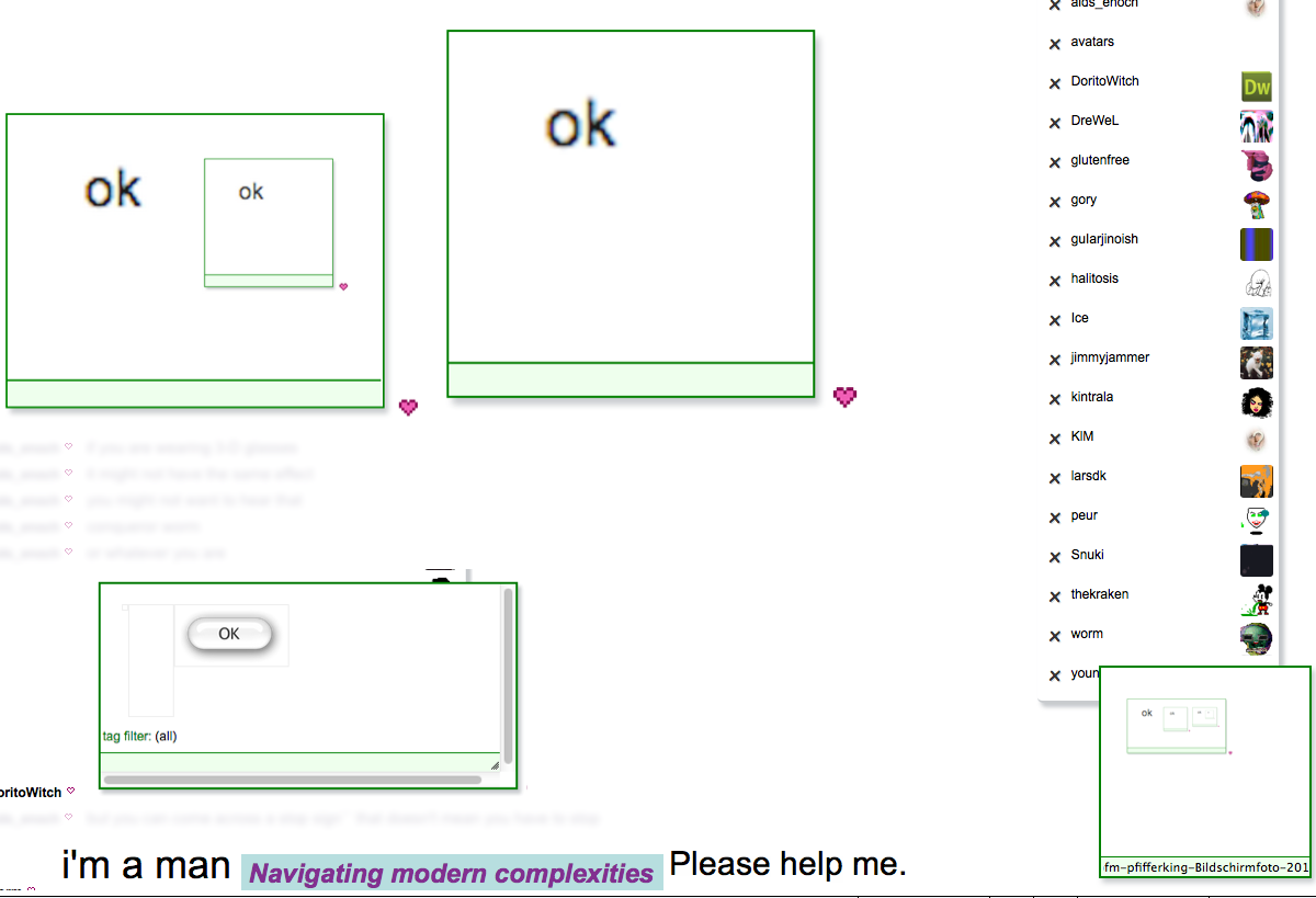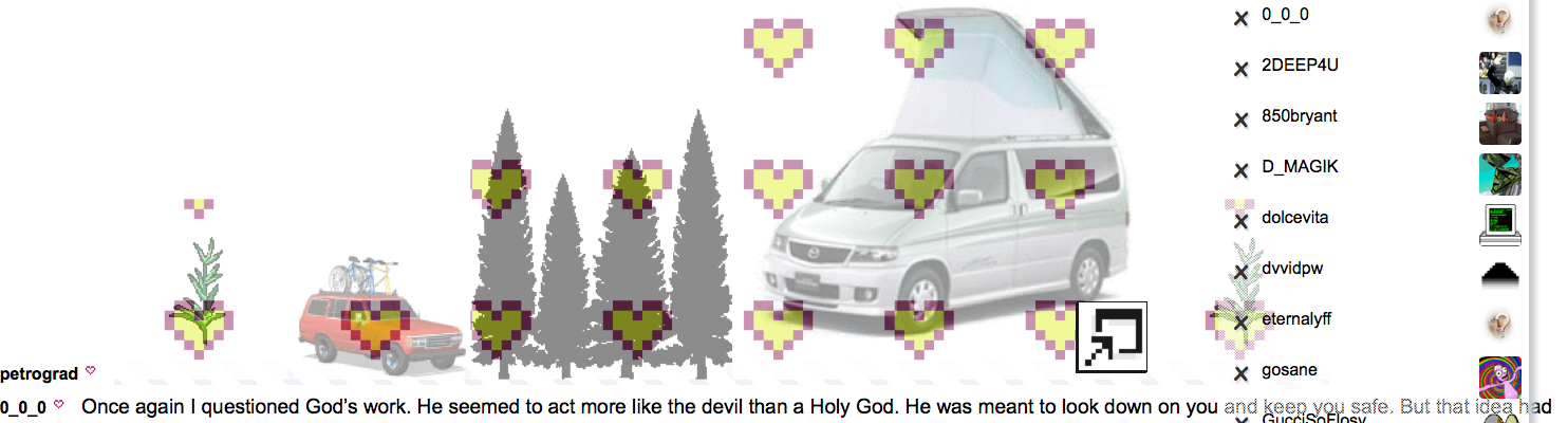 Depending on one’s taste — and one’s interpretation of the site’s raison d’être — you could say that this scrolling image flow was either interrupted or enhanced by more typical chat conversations, trolling, and obsessive webcamming. (A common, and sometimes ironic, dump was “this is an art space, not a teenage hangout.”) But the charm of this window was that it merged both webcam cheesecaking and intricate net-arting into an improvisational mega-assemblage, a particular exploitation of the real-time potential of the web that one surprisingly sees very little of. In an email to me, veteran surf-club denizen and dump regular tommoody described the difference between the “live”-ness of dumpspace versus that found in more regulated and infinitely scalable online spaces, “Dump had horizontality — the ability to compose ‘inline’ image groups on the fly, writing a sentence in pictures — and there is no surrounding framework for posts, such as Twitter’s … which imposes a kind of rigid logic and reminds you at all times that someone else is the boss.” Everybody present on dump had to share the chat window with everyone else, with speed of response being more valuable than quality. Whether or not you decided to directly communicate with others, you were all together in one compositional space, “fave”-ing with hearts that did not seem a creepy imposition (as with Twitter) but a show of genuine affection for those with whom you shared this space, at all hours, for years. Neither an art-world-ish “internet surf club” nor a monetized zeitgeist sump pump, dump seemed to harken back to a pre-1997 internet era, when it was possible to imagine that the users you met online were a small enough cohort to seem communitarian, but not large enough to merely replicate the social structures and hierarchies of the world at large.