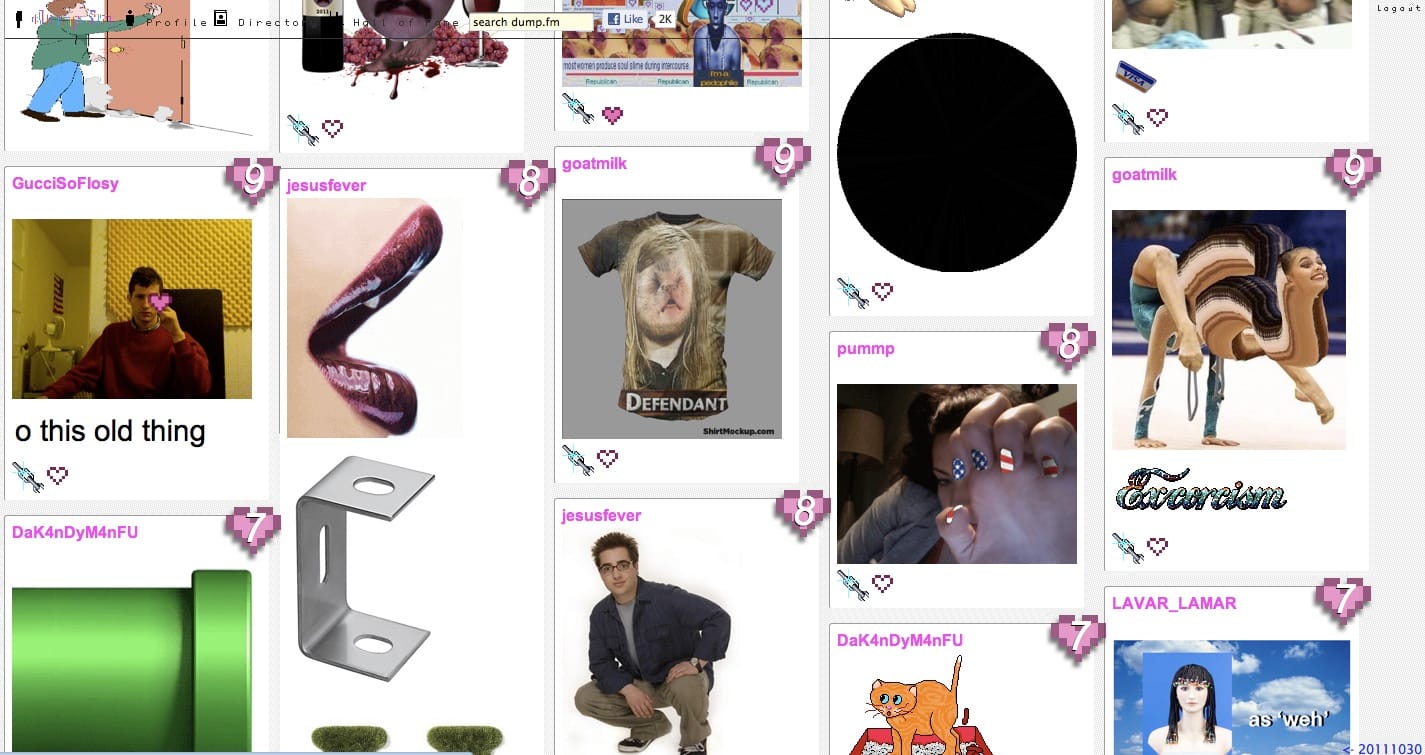 Unlike the multiply niched and customizable web at large, there was only one window for adding dumps. You could change it to black-screen or full-screen mode, you could mute users if boring or offensive, and there were some secret and rarely used alt rooms (the /art room, the /sex room, the /lisafrank room), but that was about it. At the bottom there was a field in which you could paste image urls end-to-end to form a collage, plus an upload button, and a webcam button. To the right, you could see all the users currently online and their dump score based on accumulation of favs, access to their favs, their top dumps, and the entire dump stream of each. A leaderboard greeted new logins with the best dumps of the day. Most of the time, even the best of the best barely reached ten favs.
