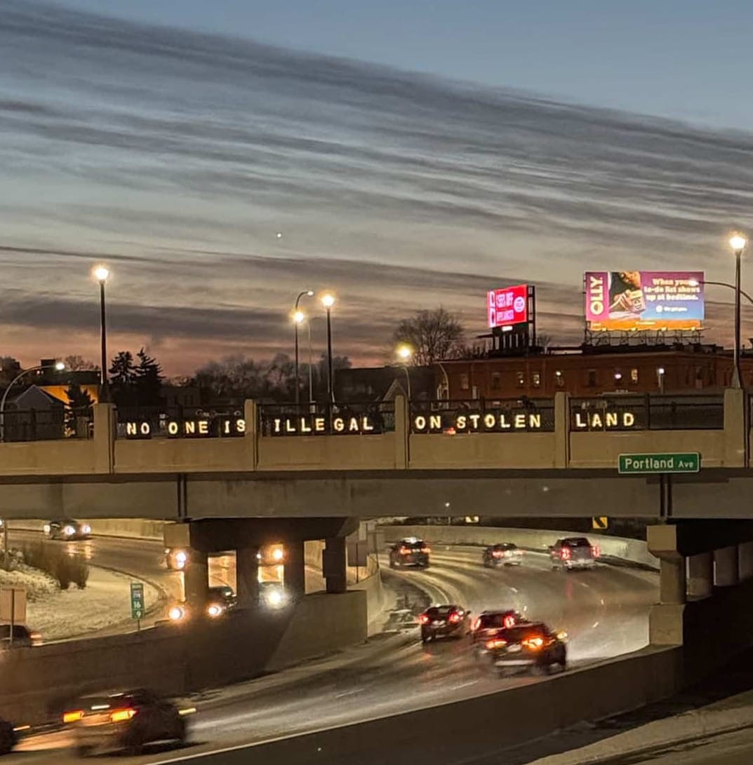 During Minnesota’s general strike on January 23, Thompson and other artists stood with a lit-up sign she designed on a bridge over a Minneapolis highway that read “No One is Illegal on Stolen Lands… ICE OUT OF OUR HOMELANDS.”