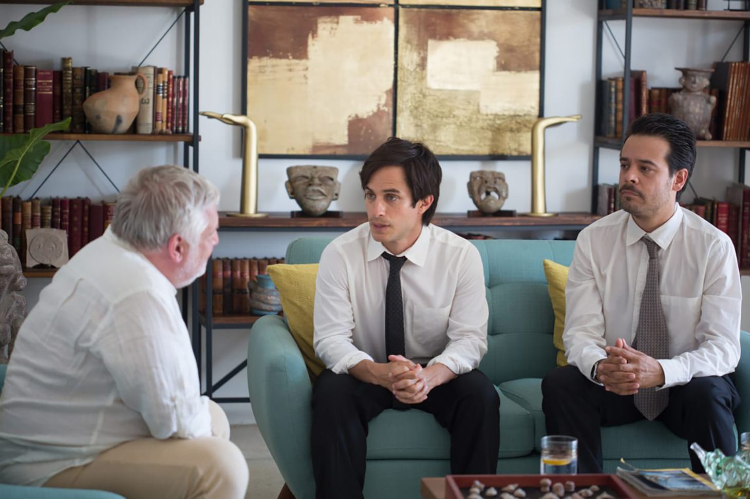 In Ruizpalacios’ version of the story, the thieves are Juan Nuñez (Gael García Bernal), a fine-boned man-child who hasn’t quite finished his veterinary degree, and his best friend Benjamin Wilson (Leonardo Ortizgris), whose big eyes and flair for indecision make him seem like an abandoned puppy who hangs out with Nuñez because he can’t find any other friends; you feel a little sorry for him. Both in their 30s, they live in Ciudad Satélite, a fairly vanilla upper middle class urban development that skirts the edge of Mexico City. Neither of them are going anywhere in life, a fact that Wilson seems to have made peace with, but Nuñez hasn’t — he dreams of escaping the cyclical banality of life around him. And so, borrowing his father’s car, Nuñez convinces Wilson to sneak into the National Museum of Anthropology with him, solder off glass cases, and steal some of the museum’s prized artifacts, which they later plan to sell.