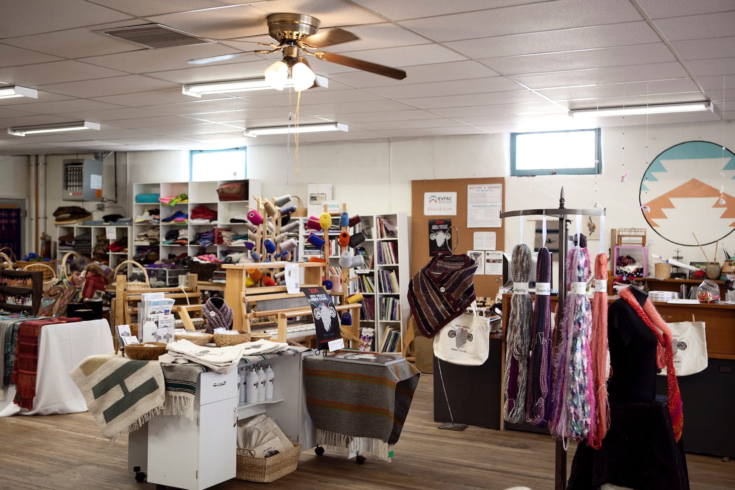 Education, for both established fiber artists and newcomers, is fundamental to EVFAC’s mission. To achieve these ends, the organization’s flagship educational program Walk in and Weave was established so “anyone can craft a unique piece of handmade New Mexico.” This program, designed for any skill level, is popular among tourists and locals alike. EVFAC also offers professional development opportunities alongside facility and equipment rentals, where any member of the community can rent out the EVFAC facility, gaining access to looms, a full dye kitchen, sewing facility, wet-felting machine, and the library.