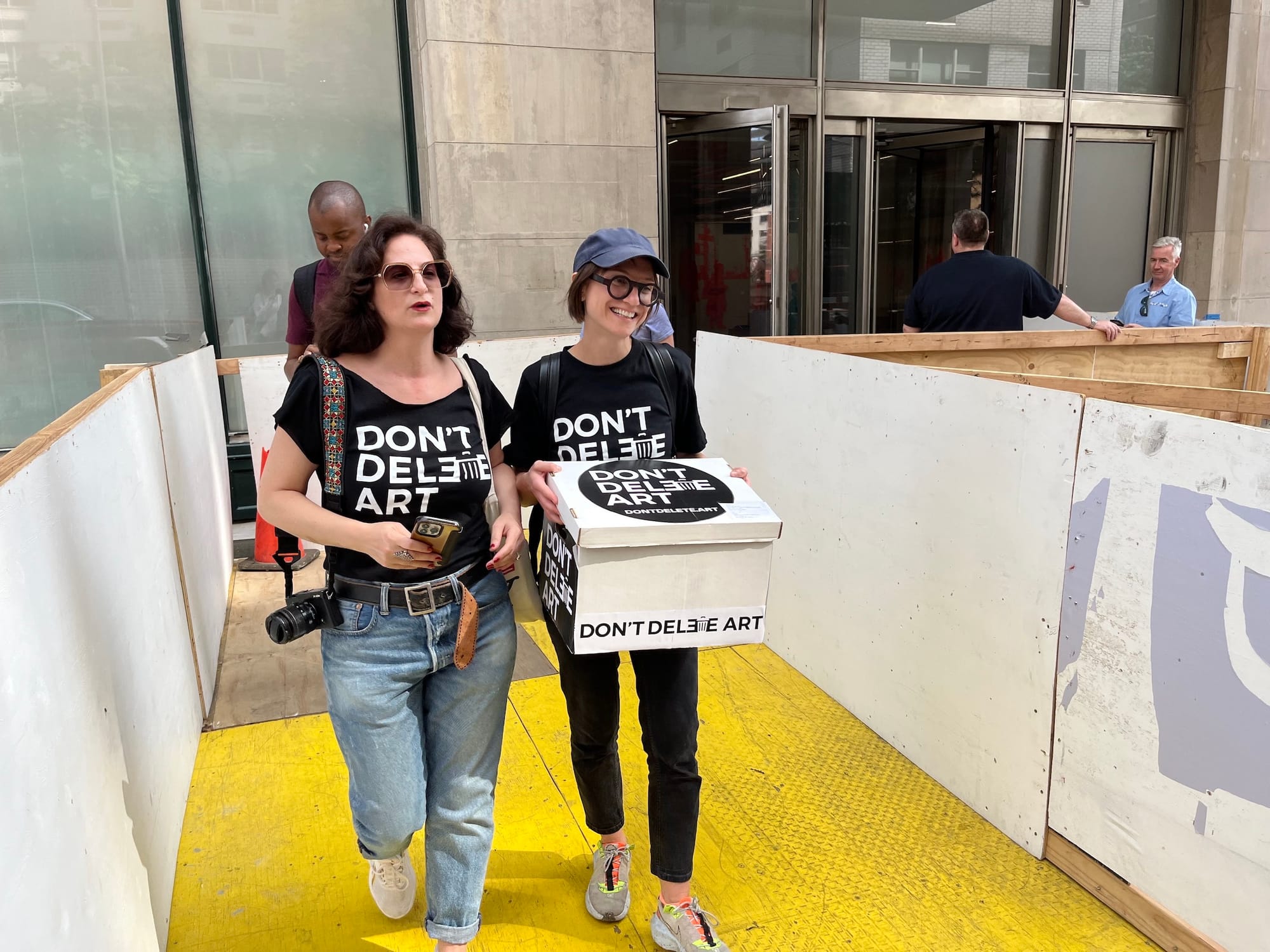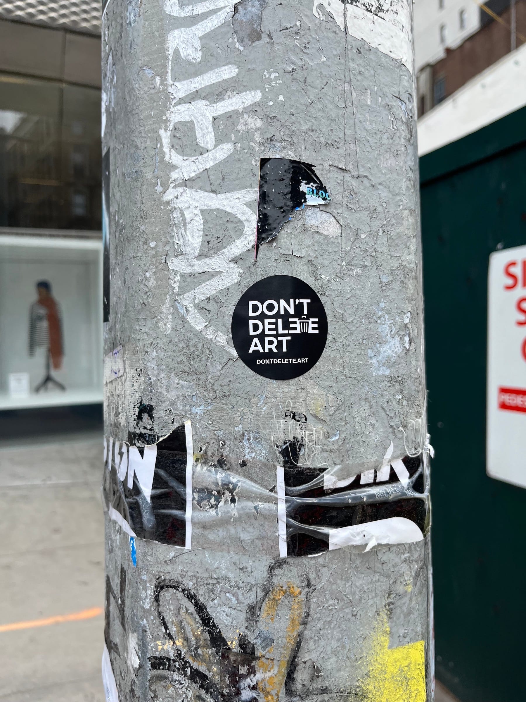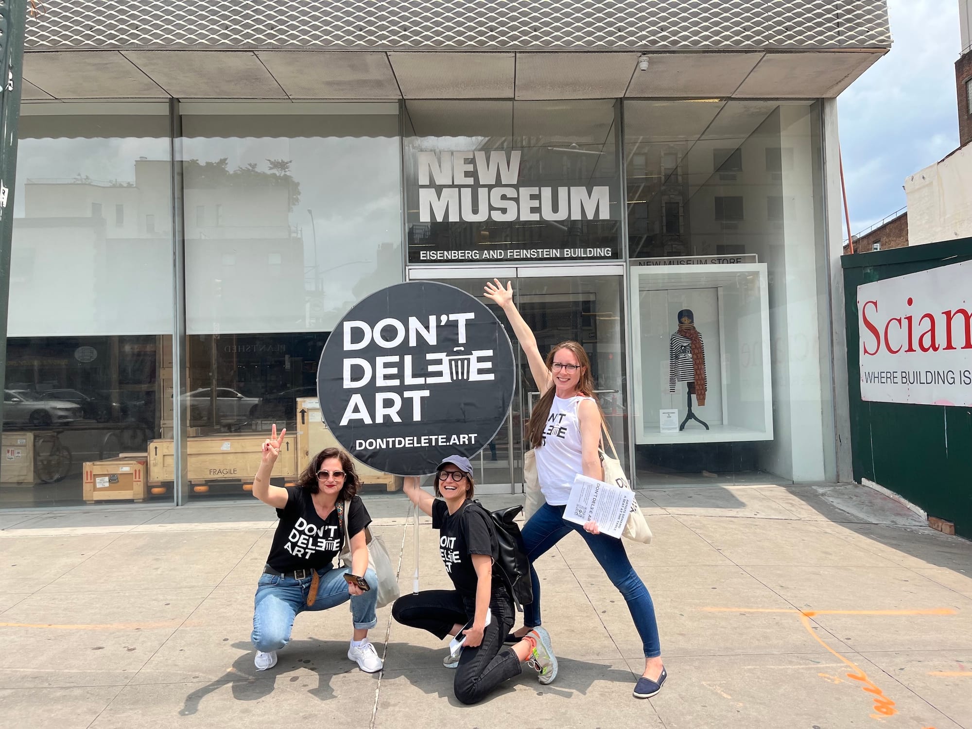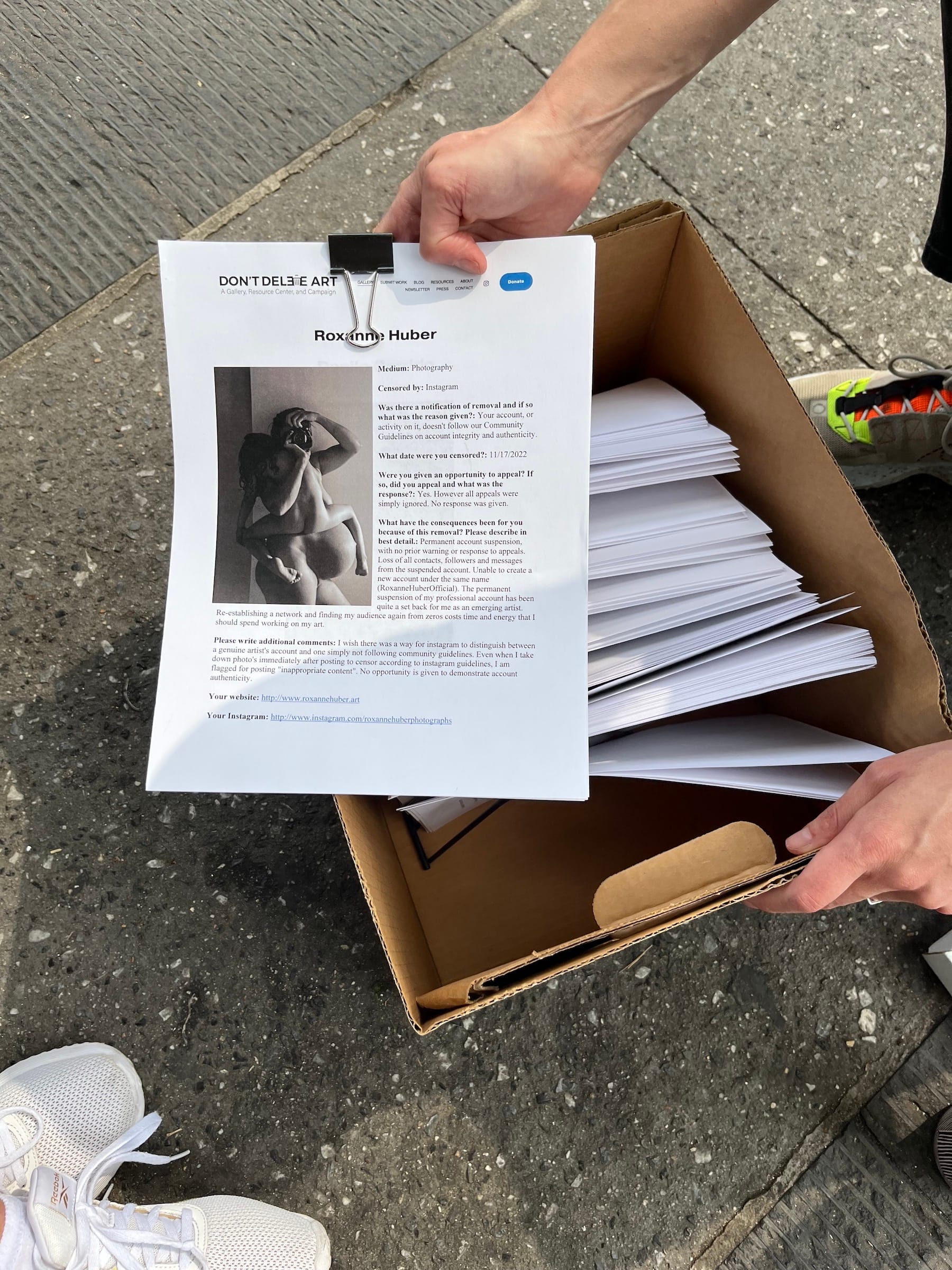 If you visited one of these five art institutions in Manhattan yesterday, June 15, you may have walked away with a flyer and a black sticker labeled "Don't Delete Art." Between 11am and 3:30pm, a group of four organizers leafletted at the Whitney Museum of American Art, Parsons School of Design, the Magnum Foundation, the New Museum, and the International Center of Photography Museum, informing passersby of their frustration with art censorship on social media. The daylong action culminated at the Meta headquarters in Noho, where the activists hoped to hand-deliver a manifesto and accompanying petition signed by 2,172 people to a representative of the company, the parent organization of Instagram and Facebook.