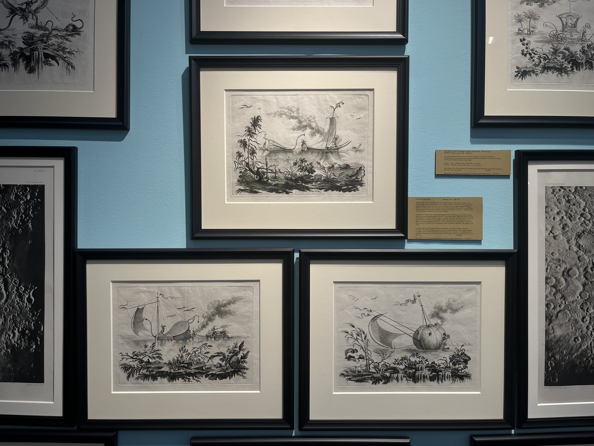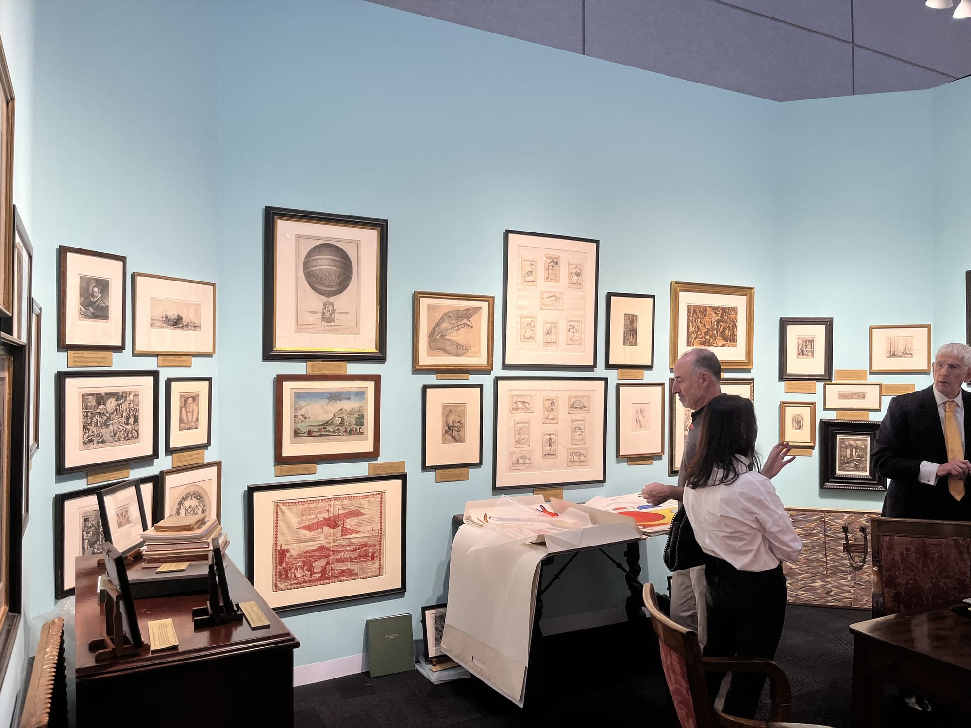 "We are antiquarians," Alan Stone of Hill-Stone Gallery, located in South Dartmouth, Massachusetts, told Hyperallergic. Gilded frames lined the faint blue walls, and additional works rested on antique furniture. Although odd 18th and 19th-century ephemera could be seen across the fair, Hill-Stone's booth offered some of the strangest. Co-owner Lesley Hill pointed to a personal favorite: a series of 18th-century etchings of the moon, complete with pumpkin sailboats. Hill and Stone said they come to the fair to attract the eyes of curators and collectors, but also to see what other booths are offering, and sometimes, to buy works.