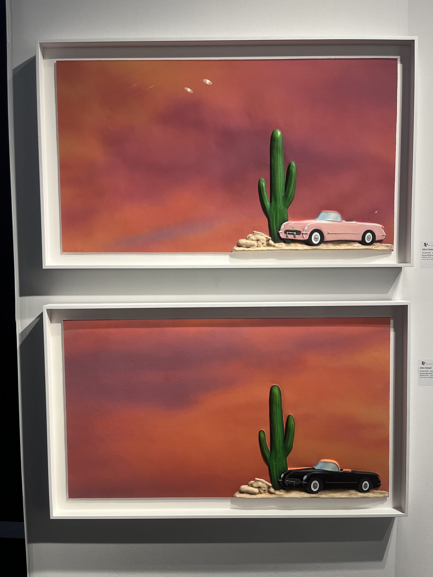 Mixografia, a gallery and printmaker in Los Angeles, exhibited some of the fair's most inventive works. To create his reliefs of cars and cacti, artist Alex Israel first created sculptures of his subject matter, which the printmaking studio then scanned, scaled down to a one-inch relief, and generated with a 3-D printer. The studio then made a mold, created handmade paper, painted the mold, and finally pressed the sculptural paper into the inked mold. The result is a highly-detailed work, complete with shading to match the shadows of the relief.