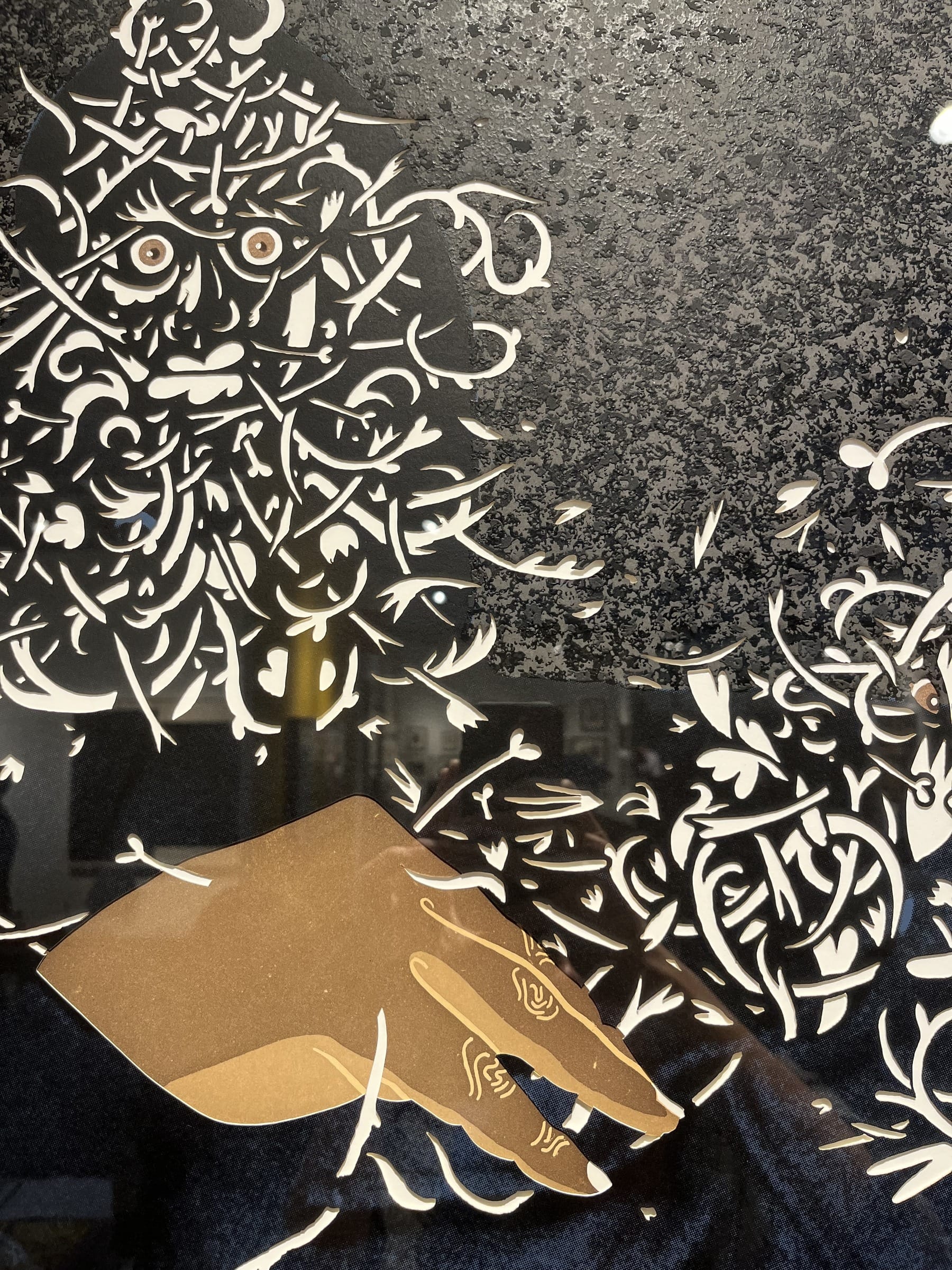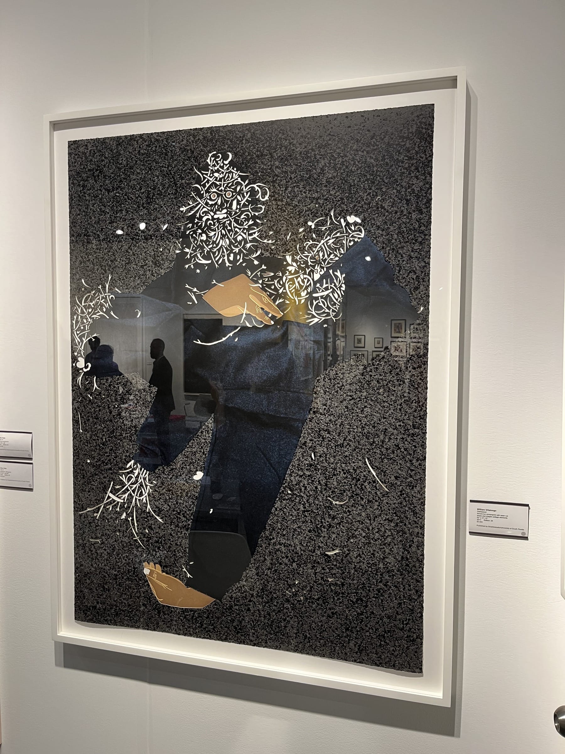 Upon entrance to the fair, visitors are met with the IFPDA's large-scale Derrick Adams commission "Eye Candy" (2022), a colorful contemplation of Blackness, masculinity, and consumerism, and a work so eye-catching that it's easy to forget prints are sometimes disregarded in the art world. At Thursday's opening, art consultant Victoria Hayward told Hyperallergic that she thinks prints are often overlooked because they aren't one-of-a-kind.