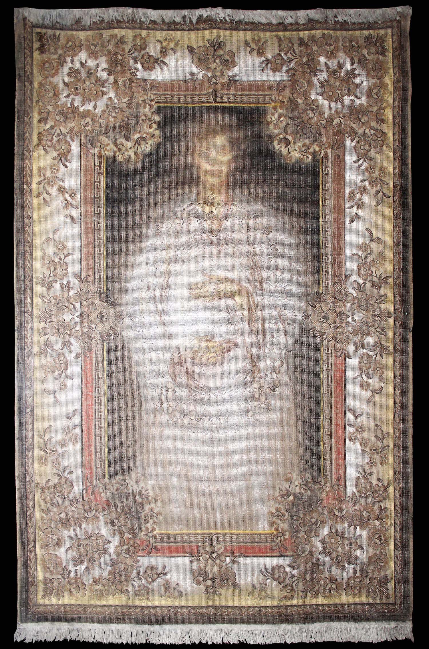 Using an antique rug as his canvas, Martorell’s “Consuelo (Las manos de Andrea)” (2019) honors the artist’s sister, Consuelo, remembering her as an expectant mother. Adding another layer of mourning and remembrance, Consuelo’s hands were modeled by Andrea Ruiz-Costas, who would become a victim of gender violence and a failed system. The 35-year-old was murdered in 2021 by her former partner after she appeared in court more than once seeking protection.