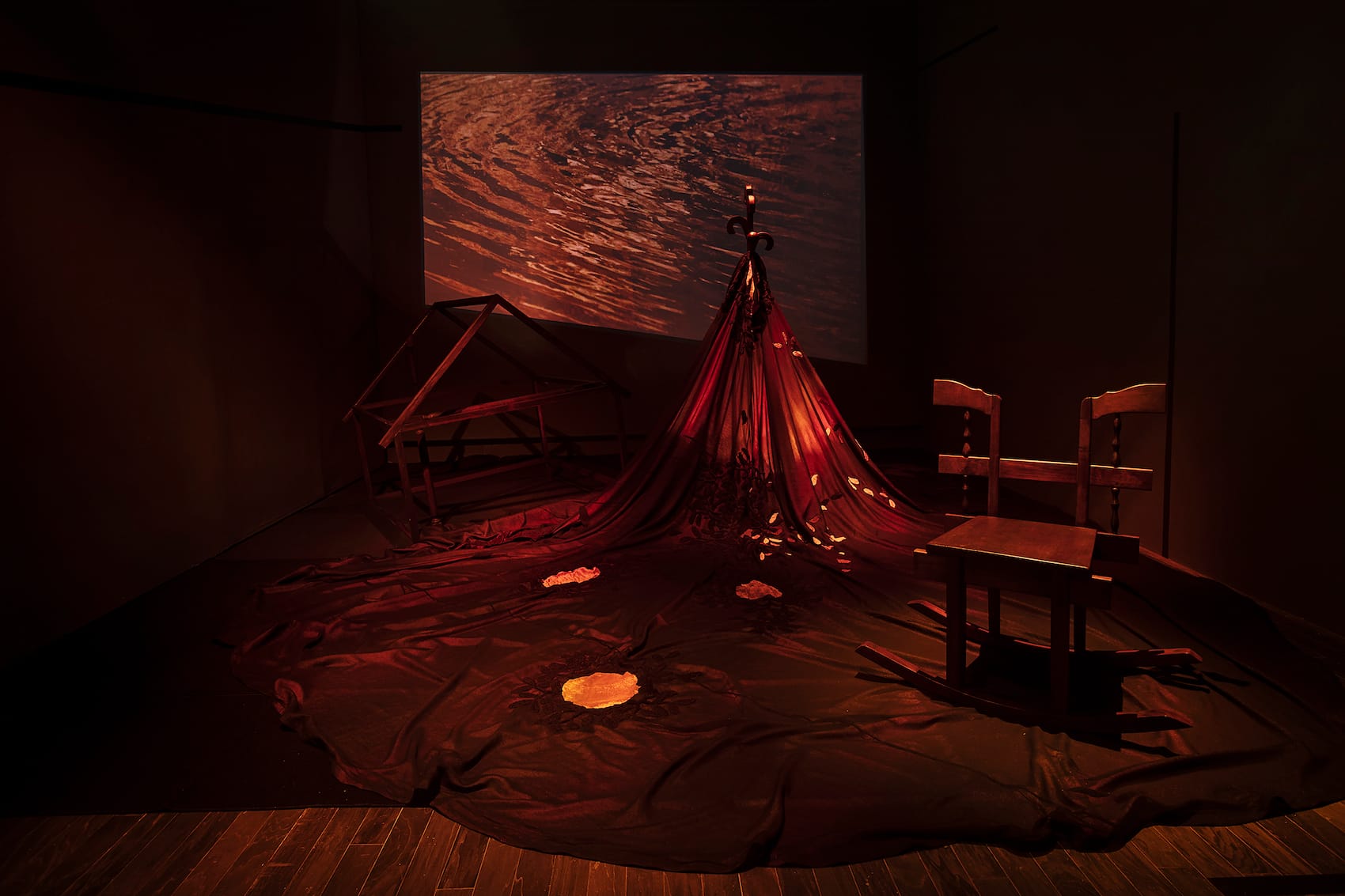 For her deeply contemplative work “Un minuto de silencio” (2005), Carola Cintrón-Moscoso requested a moment of silence from strangers in a park. Dhara Rivera’s “Minuflí ahora” (2021), an eerie gallery-wide installation, commissioned by the MAC en el Barrio program, was inspired by her grandmother’s stories of the 1899 hurricane San Ciriaco. In this piece, a rocking chair that swings to and fro ominously, like a pendulum, and a length of fabric with crochet patterns are juxtaposed with a video projecting the calming image and sound of water. As she invokes her grandmother and her family’s sewing history, Rivera transports viewers to a physical and emotional space in which, as the curator reflects, solace finally comes.