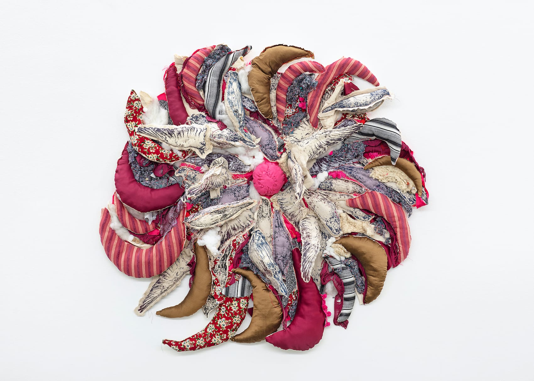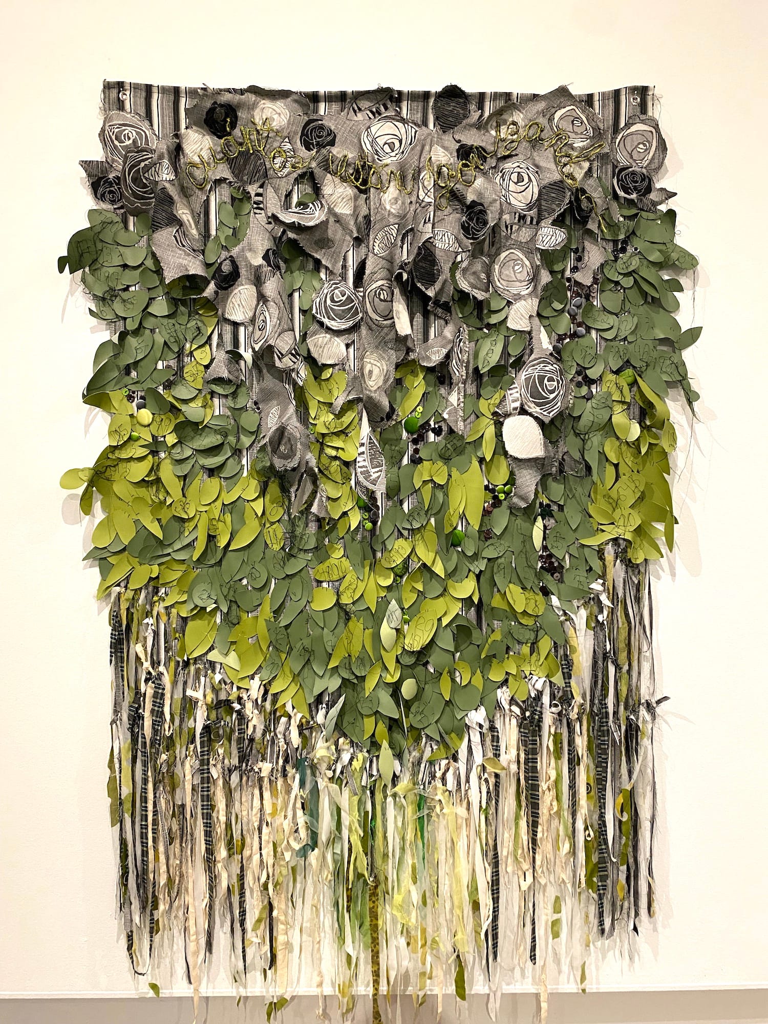 In the first gallery, Frances Gallardo and Elsa María Meléndez enact the “labor of mourning” through textiles and fabrics. Gallardo’s pieces trace in embroidery and openwork paper the familiar yet terrifying image of a hurricane, while Meléndez reflects on the hurricane and accumulation through works composed of textiles and embroideries from a fabric store destroyed by María.