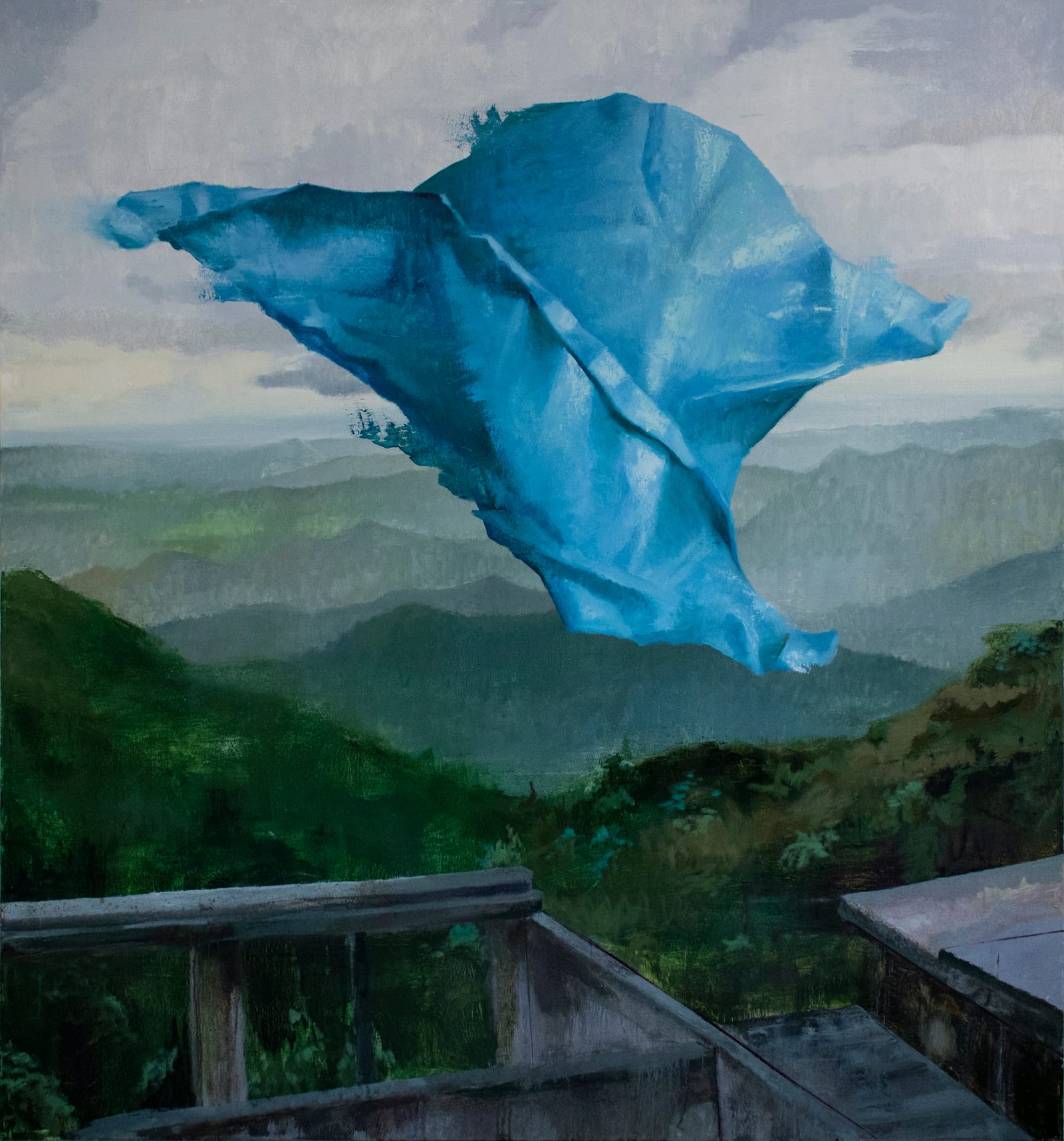 Every artwork on display in the show reflects a personal connection. In Jotham Malavé’s painting “Viento Cegador” (2019), a blue tarp floating over a rural landscape refers to the roofs thousands of people lost after María, depicting a landscape intertwined with painful memories for many Puerto Ricans.