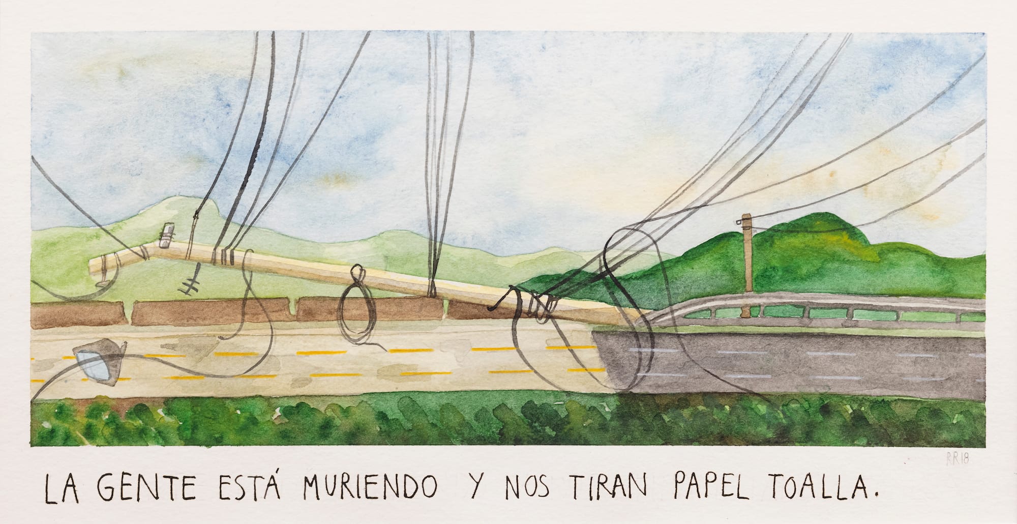 Other artworks invoke mourning in relation to colonialism, AIDS, and migration. The exhibition also touches on anger; circling back to Hurricane María, Rosaura Rodríguez-Muñoz’s watercolors, such as “La gente está muriendo y nos tiran papel toalla” (2018), articulate the anger many Puerto Ricans felt toward the local and federal governments for their failed response to the hurricane. In this piece, the artist alludes to the island’s blackout following María’s destruction through images of fallen electricity poles and the public outcry that ensued when Donald Trump threw paper towels at a crowd while surveying the storm's aftermath.
