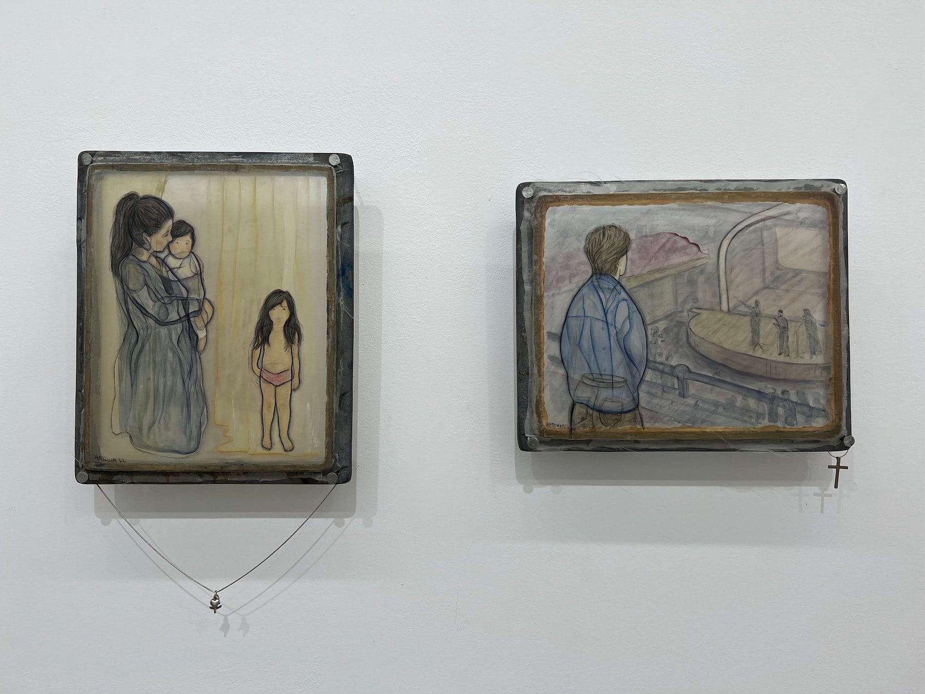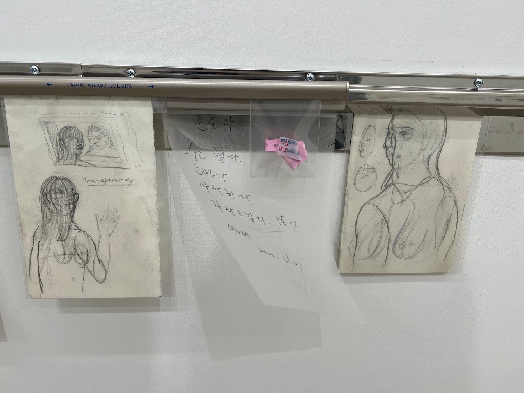 A silver ticket rack running along the perimeter of the exhibition space at average waist height is adorned with other ephemera from Aatchim’s past. Paralleling the artist’s own evolution, this autobiographical feature is in a state of constant flux, as she visits the gallery regularly to rearrange and add new objects. A cacophony of offbeat trinkets — a hospital bracelet, rose-shaped embroidery patch, ceramic dish, metal pin, desiccated butterfly, tiny blue pill still encased in its foil packaging — are dispersed among a vast collection of looseleaf sketches on sheer paper, unfinished drawings of people and places that echo the framed works hanging above. Most compelling are the scores of typed and handwritten notes and poems excerpted from iPhone memos and diaries Aatchim has kept diligently over the last decade, in both English and Korean.