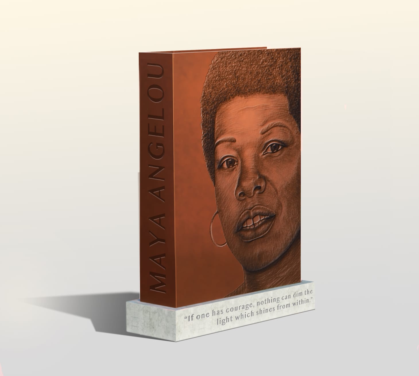 Lava Thomas, who lives in Berkeley, heard on August 9 that her design, “Portrait of A Phenomenal Woman,” had been chosen. It showed a nine-foot-tall bronze book with Angelou’s face on it and a quote from the author: “If one has courage, nothing can dim the light which shines from within.” Then, on August 22, she got a call from Dorka Keehn, chair of San Francisco Arts Commission’s Visual Arts Committee, telling her that the sponsor for the project wanted a different design.
