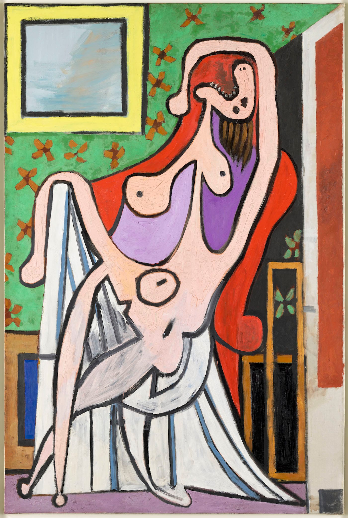 In 1927, Picasso met Marie-Thérèse Walter, then just 17 years old. Enamored, he secretly brought her to Brittany during a family vacation and was inspired by his new mistress to create his Bathers series (1928). In the paintings, Walter was everything Olga was not: bright, aerial, erotic. With his marriage essentially over, Picasso began to eviscerate Olga in his paintings. In “Nude in a Red Armchair” (1929), her contorted limbs are splayed over the seat, her breasts dangling from her throat, her mouth open in agony. It’s a disturbing, grotesque image, a violent distortion of the woman Picasso had painted in another armchair just a decade earlier to celebrate their engagement.