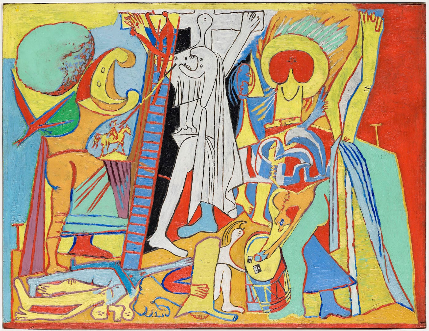 While Olga’s physical manifestation filled Picasso’s earlier canvases, it’s her metaphorical presence that looms over his paintings dating after this period. Walter’s arrival as Picasso’s new muse cemented the growing rift between the couple, though they would stay legally married until her death in 1955. Recognizable by her disheveled hair, open jaw, and bared teeth, Olga appears in many of the artist’s Crucifixion scenes and even in his self-portraits, underscoring his obsessive need to continue to render her on his own terms.