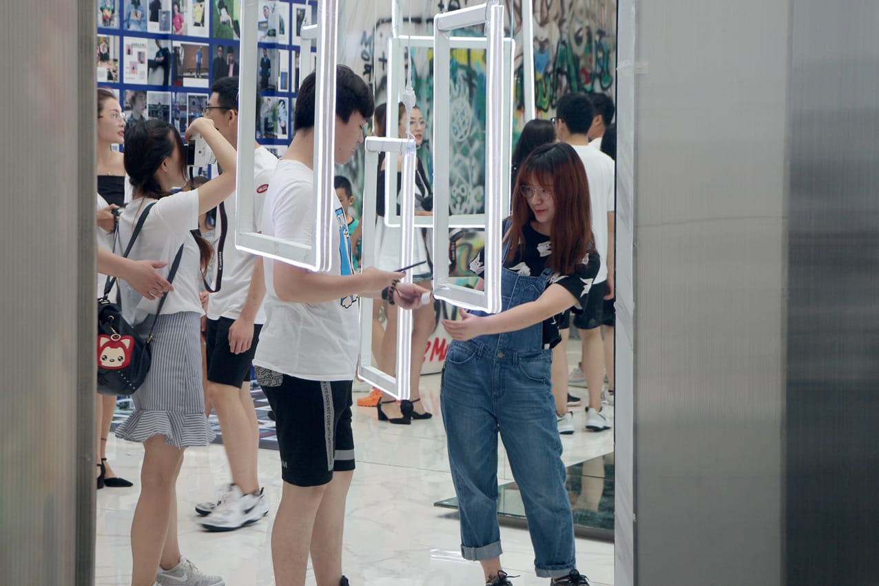 Installed in a sequence of rooms built into three of the museum’s enormous halls, Wavelength: Reset resembles a film studio in which the audience shuffles between sets. At the opening visitors homed in on the possibilities of these spaces as alluring tableaus. By midnight, constellations of images were on WeChat, China’s primary social media platform (Instagram, like Facebook, is regarded as unreliable and locked by a national firewall). Qibao, once regarded as drab wilderness, became the place to be seen. The next morning lines of debonair visitors trailed around the building, armed with impressive DSLR cameras — a ubiquitous accessory of urbane and design-conscious Shanghainese.