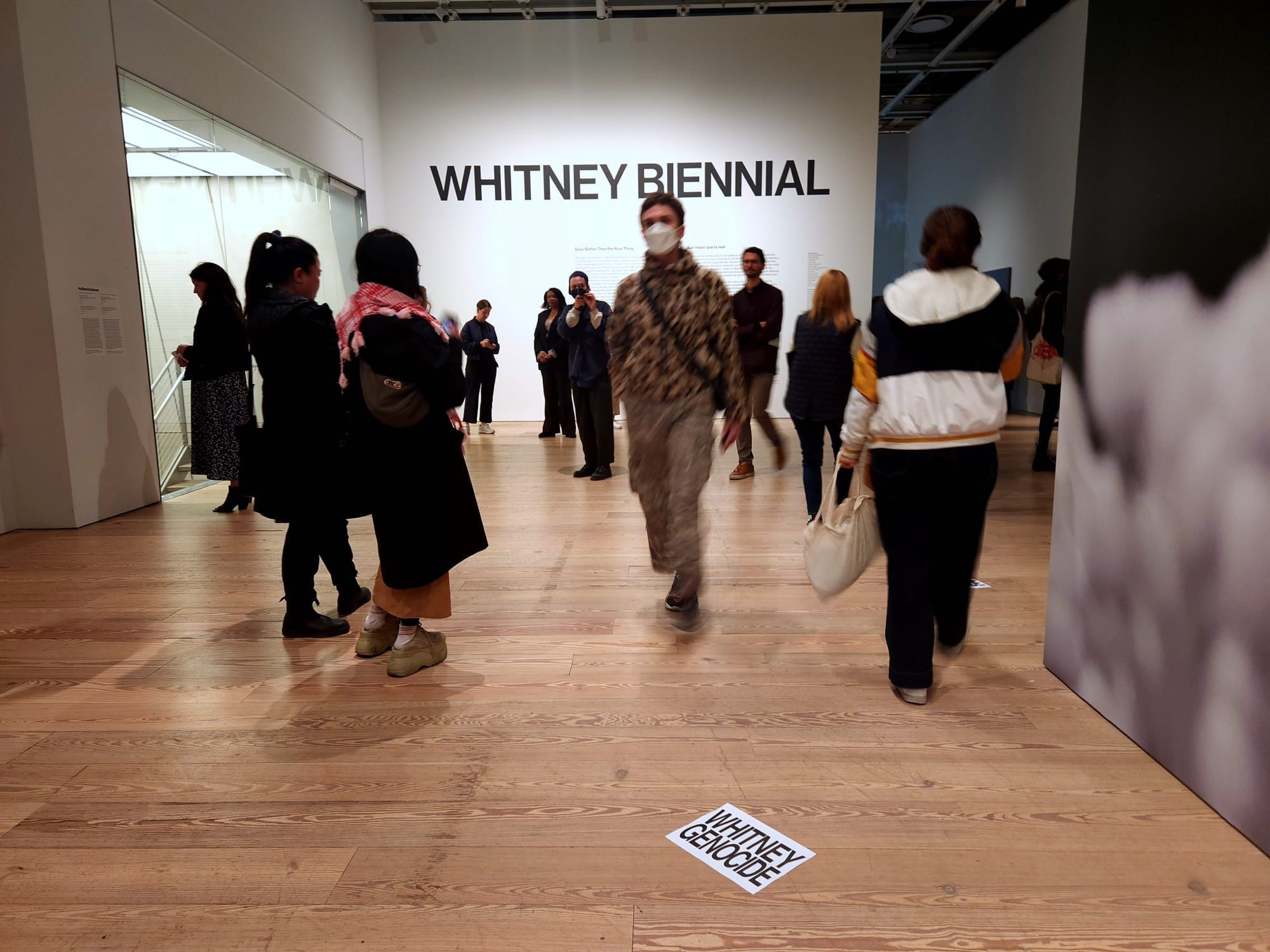 Various members of the action also held up printed press releases that read “WHITNEY GENOCIDE” and began distributing the mock pamphlets emulating the museum's own floor guides to the visitors who remained in the galleries. Organizers unfurled enormous banners from the sixth-floor terrace with the words “WHITNEY GENOCIDE NOW ON VIEW,” visible to passersby outside the museum, alluding to the advertising throughout the city for the Whitney Biennial.