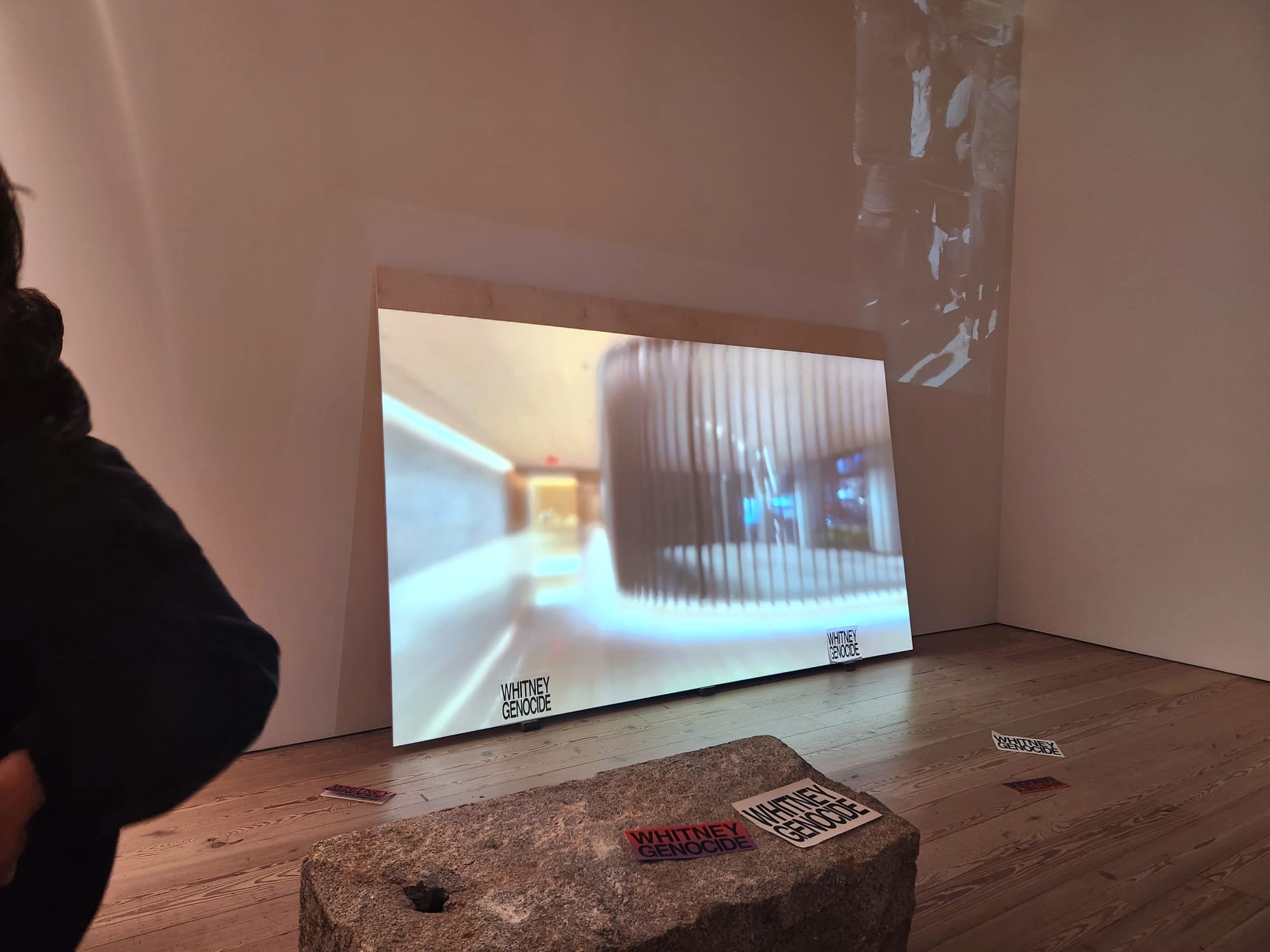 Minutes later, several video works in the Whitney Biennial currently on view were projected over with footage of families in Gaza before Hamas's October 7 attack and during the subsequent Israeli military response, which has lasted over 200 days.